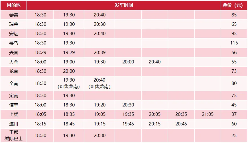 本次晚班线路覆盖会昌、瑞金、安远、寻乌、兴国、大余、龙南、全南、定南、信丰、上犹、遂川、于都等多个县区,具体发车时间和票价如下: