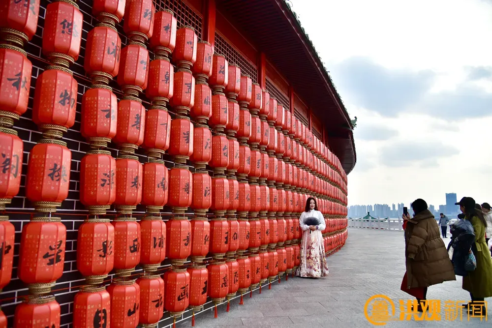 滕王阁景区的灯笼墙前满是欢声笑语。