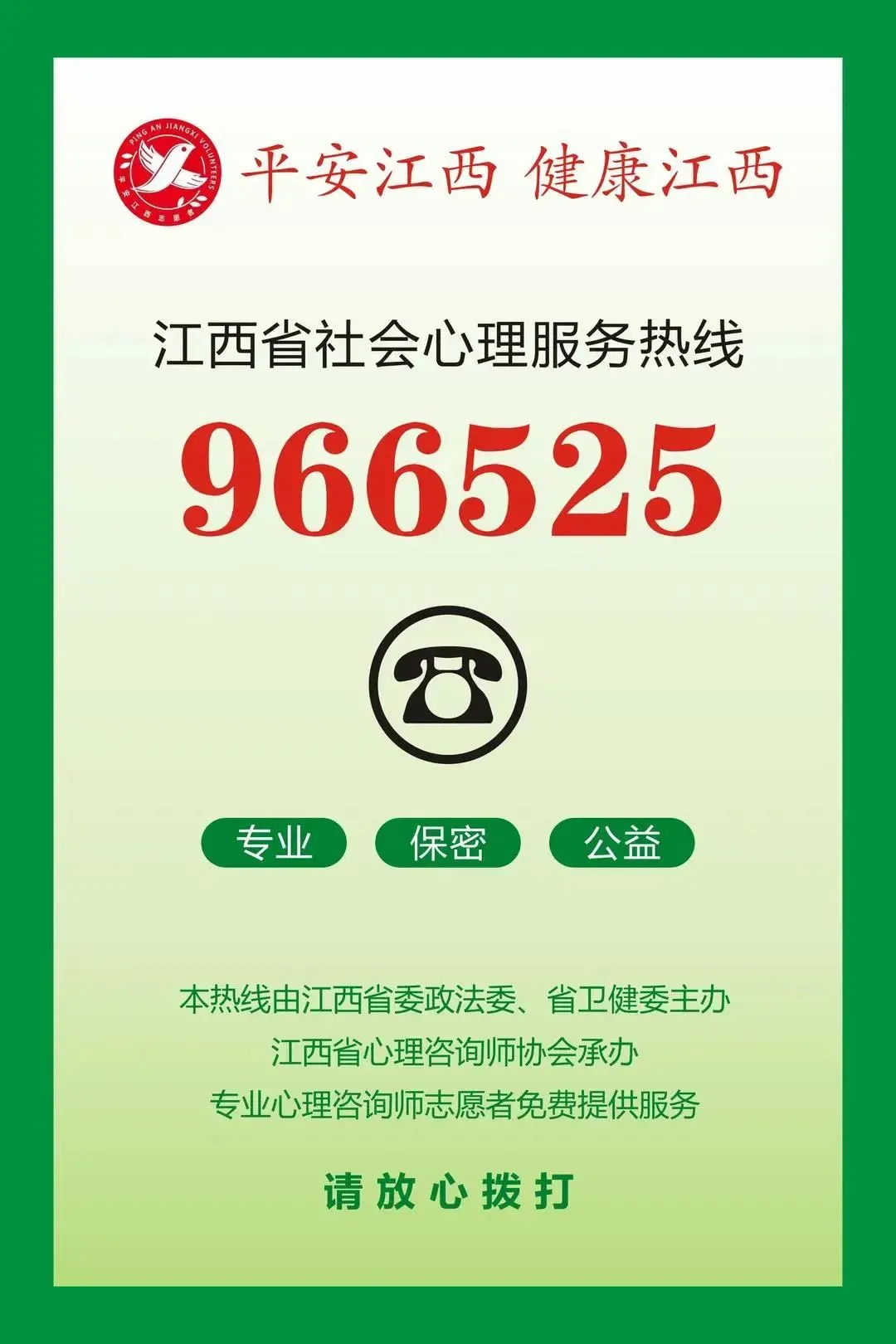 江西省社会心理服务热线“966525”:24小时提供免费心理服务。