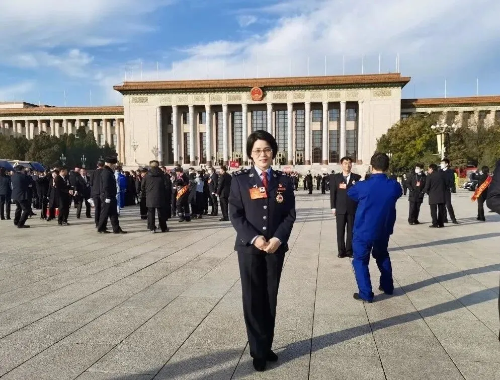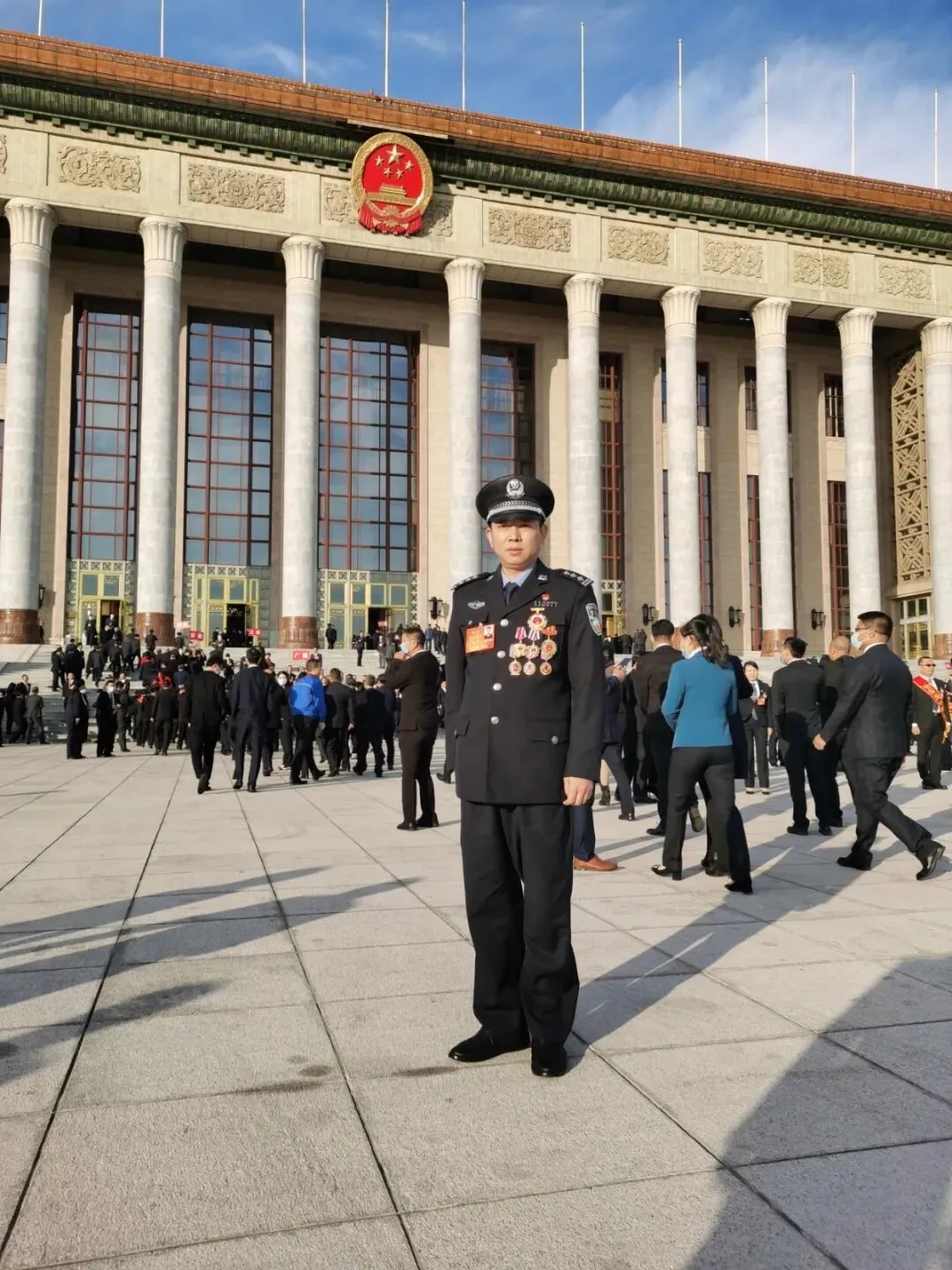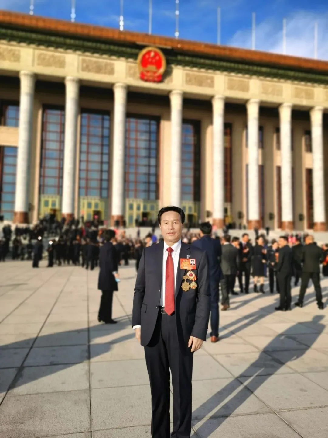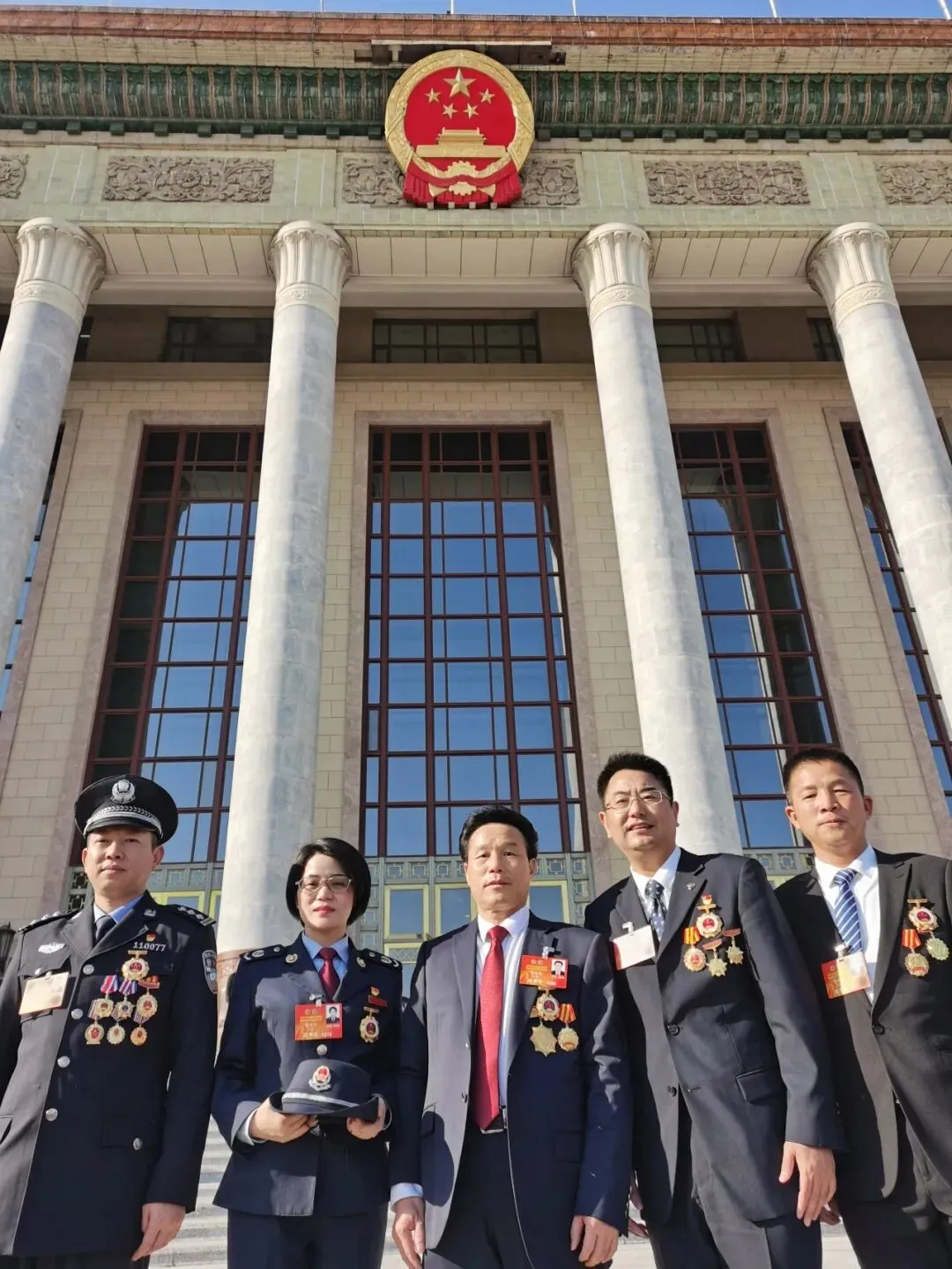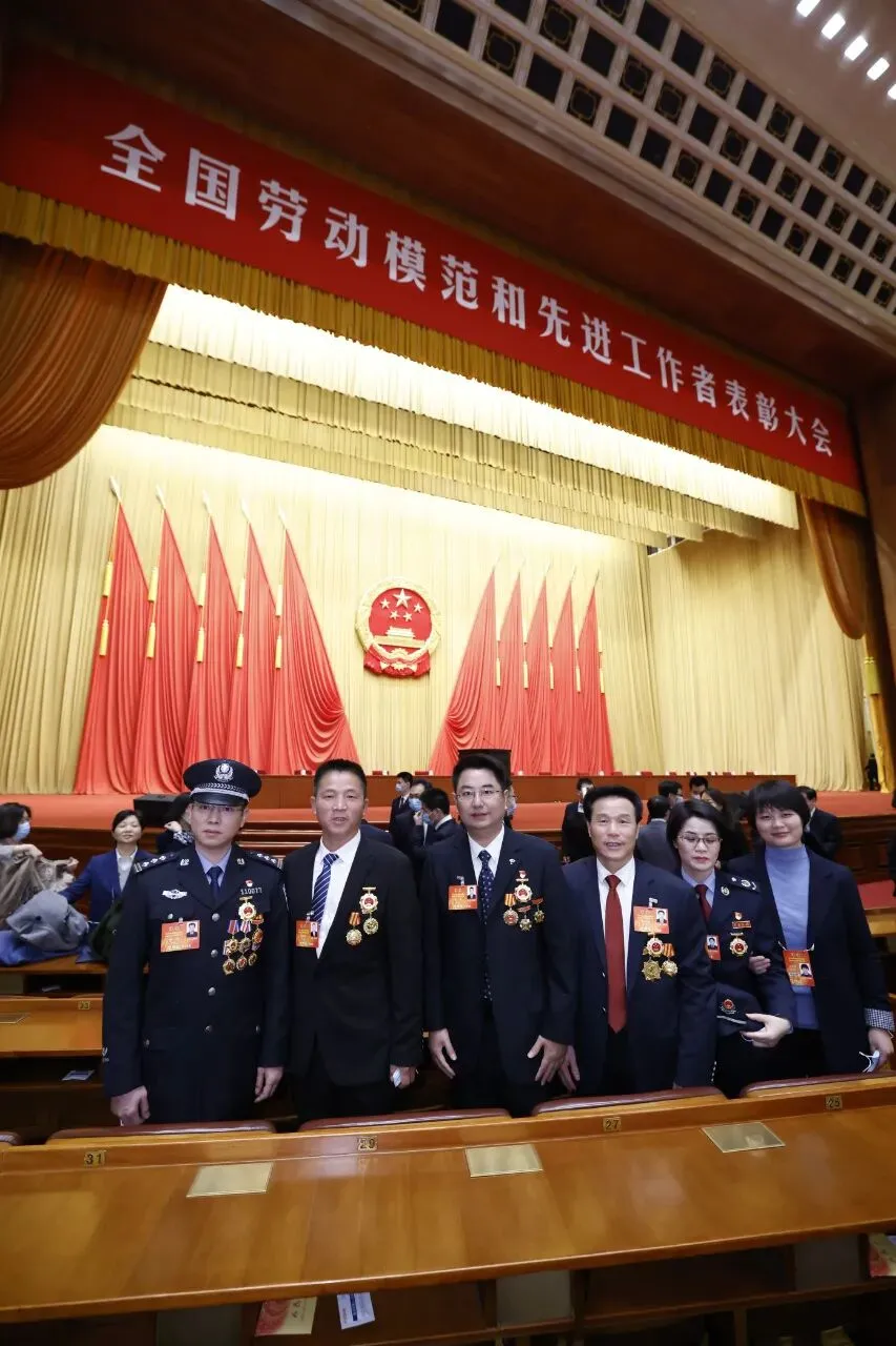 ▲五位来自抚州的全国劳动模范和先进工作者在人民大会堂前合影留念。左起分别为余超、陈玉珍、陈胜德、宗强、黄国强。