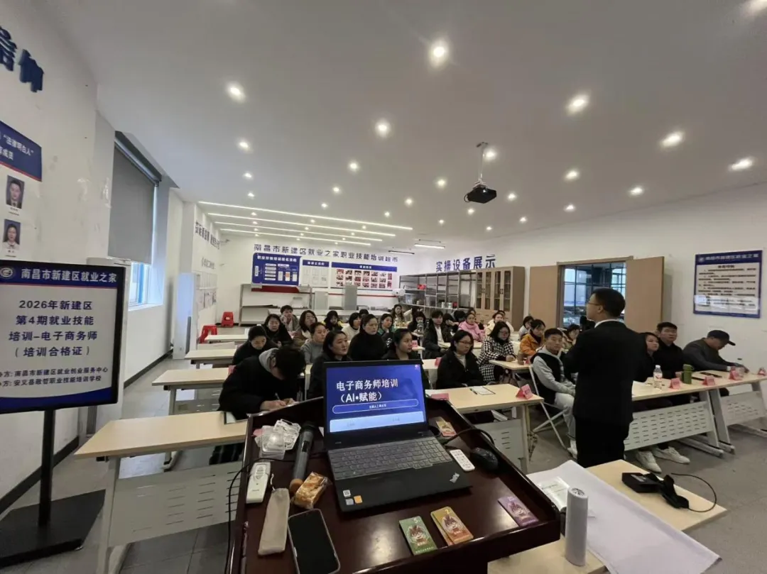 2026年1月,新建区就业创业服务中心成功举办电子商务师培训活动共4期,聚焦返乡创业者、实体店主及直播带货新人等群体,搭建务实高效的学习平台。2026年新建区第4期就业技能培训(电子商务师培训合格证)共培训36名学员,涵盖返乡劳动者、实体店主、创业青年等多个群体。近年来,在数字浪潮奔涌向前的时代背景下,新建区就业创业服务中心紧扣电商发展脉搏,通过政府出资提供免费技能培训,并结合“需求画像”精准匹配等创新服务模式,在区内大力开展电商培训,以促进就业创业,积极拓展“劳有所得”的实现路径,致力于提升基本公共服务满意度,赋能广大劳动者通过数字技能增收致富、共享发展成果。增加培训规模,筑牢人才培育根基。紧扣2026年电商发展脉搏,以政策引领与教学创新为双轮驱动,构建系统化培训体系。聚焦“降本增收、流量破局”核心需求,深度解读政策导向并制定符合市场趋势的培训课程;培训主要面向返乡劳动者、实体店主、创业青年、城镇失业人员、农村转移劳动力等重点群体,分层分类设计差异化教学内容,确保培训精准对接需求;联合电商优秀导师授课,打造“理论精讲+实操演练+案例拆解”沉浸式教学模式,课程内容直击电商运营痛点,从平台生态认知、选品定价与店铺优化的基础搭建,到直播带货冷启破销、短视频爆款创作、图文带货的内容核心,再到精选联盟达人合作、精准投放的流量玩法,全方位覆盖电商经营全流程;融入2026年电商新风口,详解AI工具全链路赋能、全域流量池运营等最新玩法,帮助学员吃透平台新规、用好平台福利,实现技能与认知的双重升级。电商培训是新建区职业培训的重点。仅在2026年1月期间,就已开展电商培训4期,培训学员100多人。所有培训均由政府补贴,学员可免费参加。精准匹配需求,激活就业转型动能。导师手把手指导学员完成直播间搭建、爆款脚本创作、剪映实操、投流复盘等实战任务,针对学员问题现场答疑、精准点拨;通过模拟直播、爆款视频创作等实操环节,让学员在真实场景中锤炼技能,将理论知识快速转化为实战能力;设置互动交流环节,鼓励学员分享经验、碰撞思维,形成“学中练、练中悟”的良性循环,助力学员快速成长。并以数字赋能为核心,帮助学员夯实电商专业技能,降低传统商户数字化转型门槛,为创业者提供低门槛入局路径;通过系统化教学,让学员掌握流量密码,在抖音全域商业生态中找准赛道、高效掘金。通过构建“需求画像+精准供给”服务模式,针对不同群体的需求开设课程,推动服务从“大水漫灌”转向“精准滴灌”。,培训后持续跟踪学员发展情况,提供资源对接、创业指导等延伸服务,助力学员实现流量变现、业绩增长,为创业增收、产业转型注入强劲数字动能。有学员在接受10天的电子商务职业技能培训(学习视频剪辑等课程)后,成功找到了新媒体运营的工作。打造服务网络,提供综合创业支持。构建了“1+18+N”三级公共就业服务体系,即1个区级就业之家、18个乡镇就业之家和多个社区(村)就业之家。目前已在全区建成52个就业之家。实现了“家门口”的便利服务,如在工业大道旁设立的零工驿站,就为务工人员直接匹配包括电商在内的灵活就业机会。除了技能培训,就业之家还提供职业指导、创业孵化等综合服务。通过群众“点单”、政府“买单”的方式,定制包括创业在内的各项服务,实现人岗精准对接。学员普遍认为培训非常实用。有学员表示免费培训让她“希望能多学电商知识实现网上就业,增加收入”。也有学员提到,培训给了她“重新出发的底气”,从商品介绍到视频产出,每一步都是实招。电子商务师培训合格证等培训是新建区“多维发力促就业”的关键一环。电商技能帮助劳动者成功切入新业态,获得更多就业选择和发展可能。新建区就业创业服务中心通过系统化、全链路运营教学,助力学员扎实掌握电商实操技能,拓宽就业创业渠道,为更多劳动者在数字经济浪潮中稳岗增收、创造价值奠定了坚实基础,全面开启了区域数字创业、技能致富的新征程。初审/稿件:张兰锋