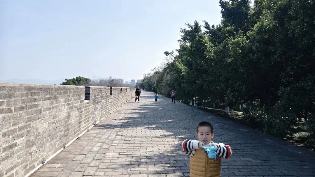 走在前面的孩子们嬉闹着,先生陪着母亲慢慢走着,轻声聊天。我跟在后面,看着这一幅画面:古老的城墙,温暖的琴声,可爱的人儿。那一刻,风清云淡,心被一种平实的幸福填得满满当当。