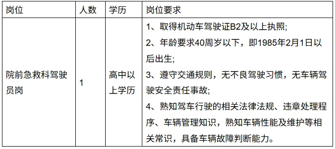 报名方式:线上报名,请报名人员将应聘材料原件(身份证、驾驶证、学历学位等证明)打包压缩,命名为“院前急救科驾驶员岗位+姓名”发至邮箱36535561@qq.com。