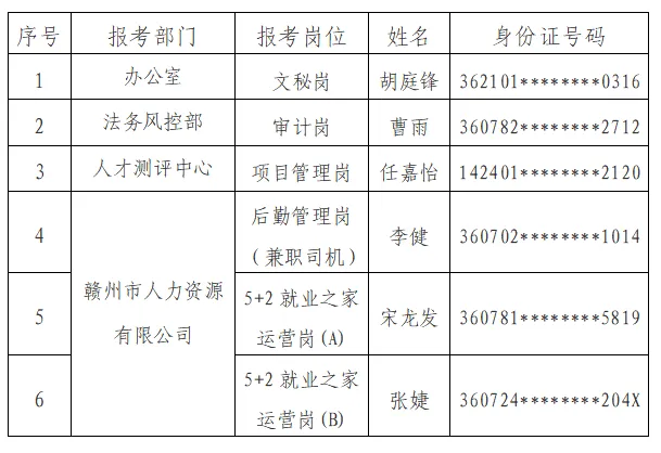 赣州市人才集团有限公司关于2026年第一批次人才招聘工作已经结束,根据招聘公告规定“根据面试成绩40%+笔试成绩60%计算考生综合成绩,并从高分到低分按招聘计划1:1的比例确定背景调查对象,进入背景调查对象面试成绩不得低于70分。”总成绩采用四舍五入法精确到小数点后两位,根据考试总成绩,按招聘岗位计划数从高分到低分等额确定入闱背景调查与体检对象。现将入闱背景调查与体检人员名单6人及背景调查与体检有关事项公告如下: