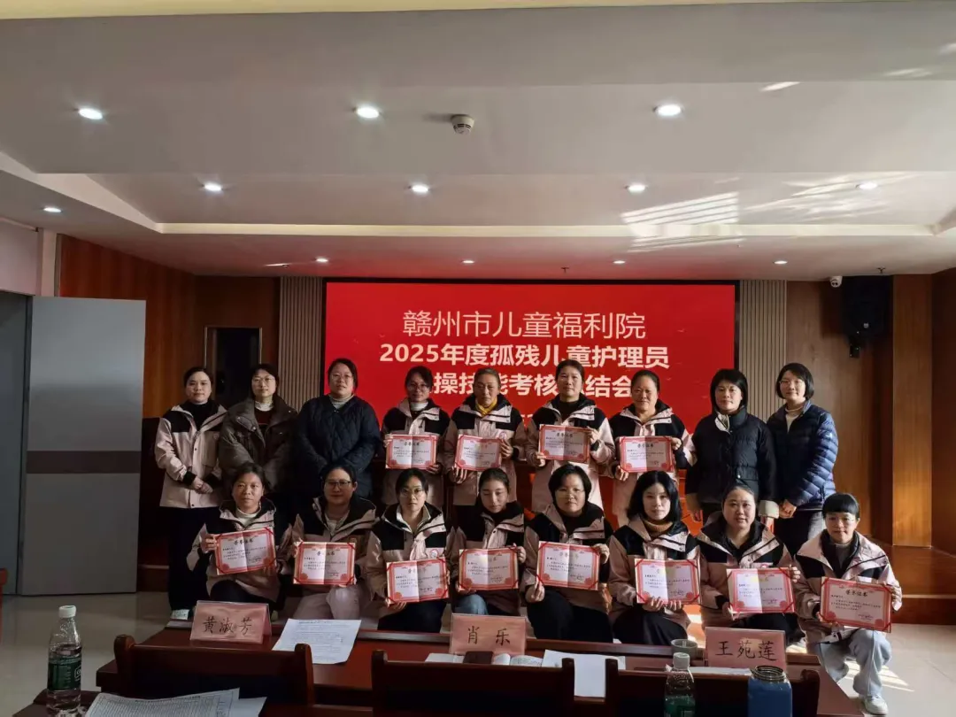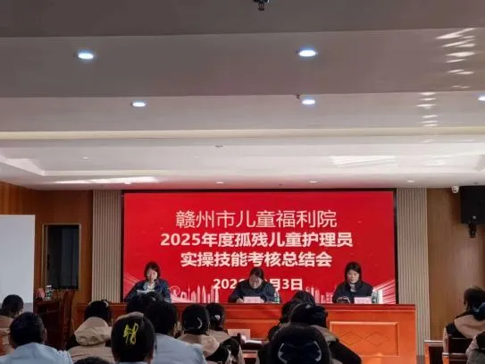 为持续提升孤残儿童护理服务质量,锻造高素质专业护理队伍,2月3日,赣州市儿童福利院召开2025年度孤残儿童护理员实操技能考核总结会。副院长郑芸妍主持会议,院长李丰出席会议并讲话,养护部全体工作人员、实操考核评委等50余人参加会议。