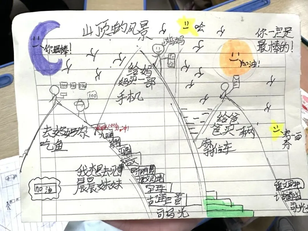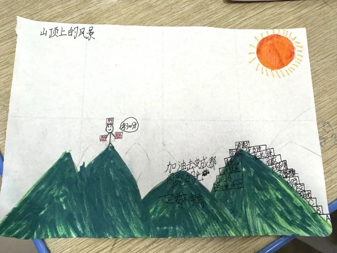 考前心理课《山顶上的风景》,将考试喻为一座可攀登的山。孩子们共绘心中的“山顶风光”,并协力搭建“四级台阶”:知识准备、复习计划、应考心法、彼此鼓励。压力,于是化为一段段可执行的路径;陪伴,则成为他们拾级而上的勇气。