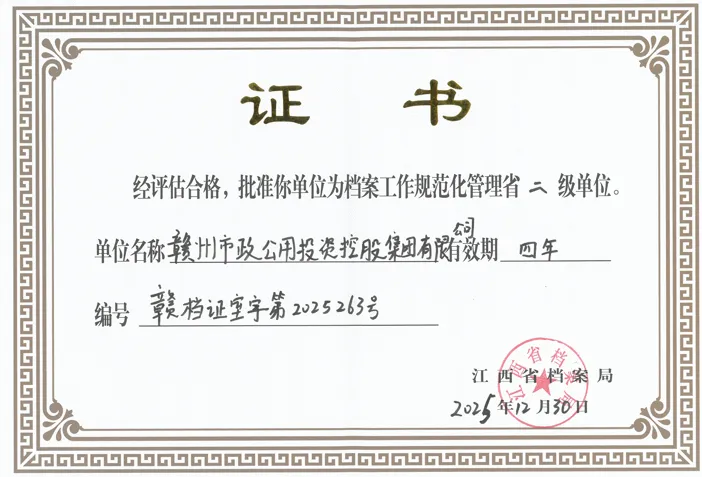 近日,赣州市政公用集团成功通过江西省档案局评定,获评“档案工作规范化管理省二级单位”。
