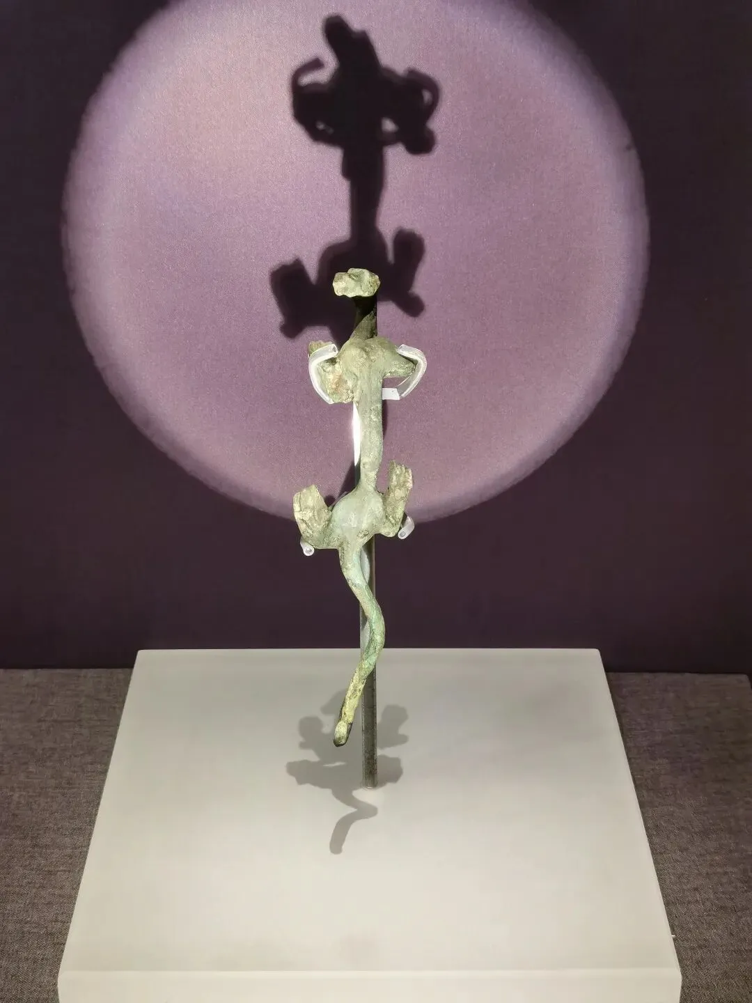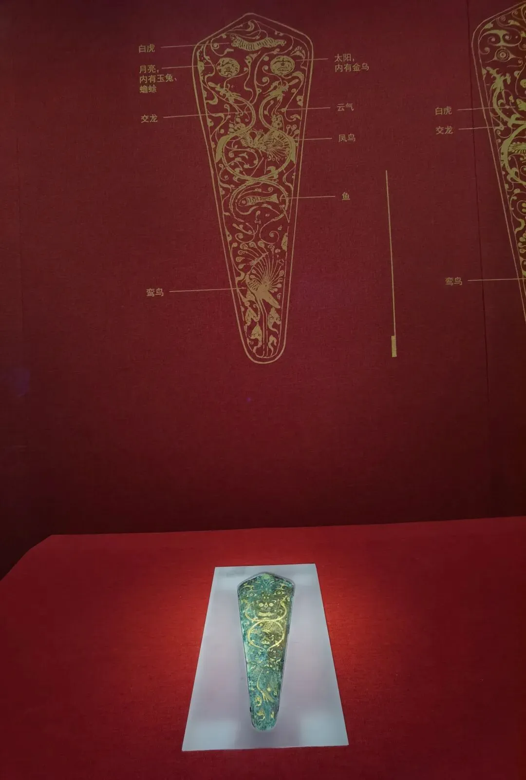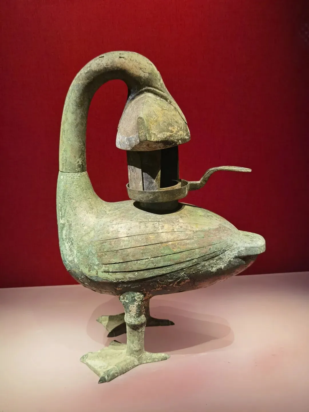 错金银神兽纹青铜当卢,主体纹饰有白虎、凤鸟、凤形鸾鸟、交龙等,辅助纹饰有太阳、月亮、山脉、云气、龟、鱼、金乌、蟾蜍、羽人等。纹饰复杂,内涵极为丰富,反映了汉代人的宇宙观及渴望长生不老、死后升仙的愿景,蕴含着独特的神话艺术神韵与艺术精神。雁鱼青铜釭灯,外形呈雁回首衔鱼伫立状,由雁衔鱼管、雁体、灯盘、灯罩组合而成,鱼身及雁颈、雁体中空相通。使用的时候灯火点燃,烟雾通过鱼和雁颈导入雁体内,被其中贮存的清水吸收溶解,达到环保无污染的效果。两片弧形灯罩可左右转动,既能挡风,又可调节灯光亮度、光照方向。雁鱼灯不仅造型优美、科学实用,还包含着吉祥的文化寓意,“鸿雁衔鱼”的祥瑞造型体现了汉代人对生活的美好愿望。