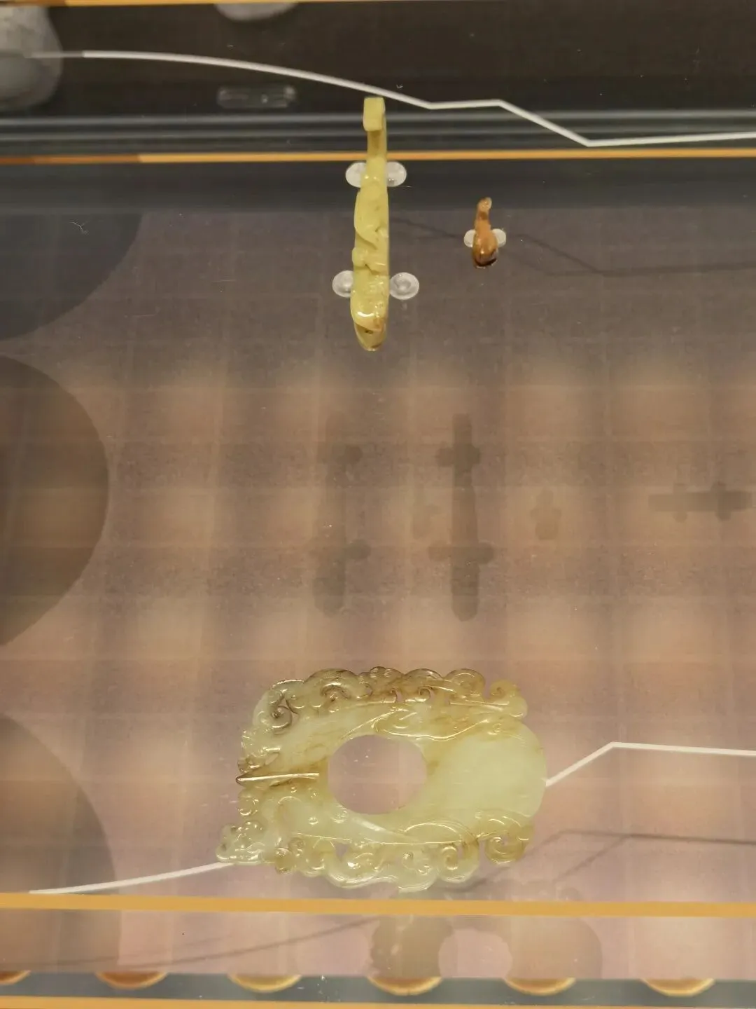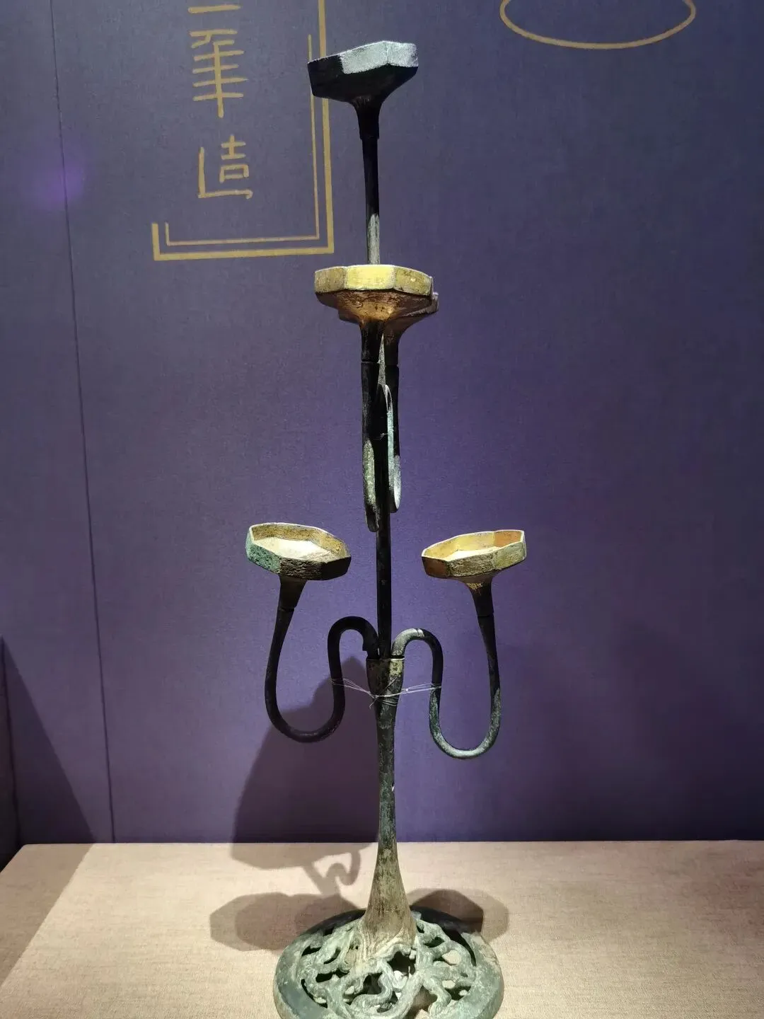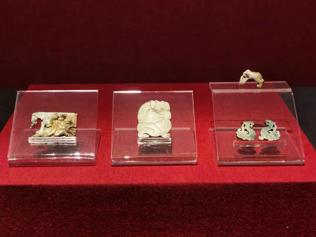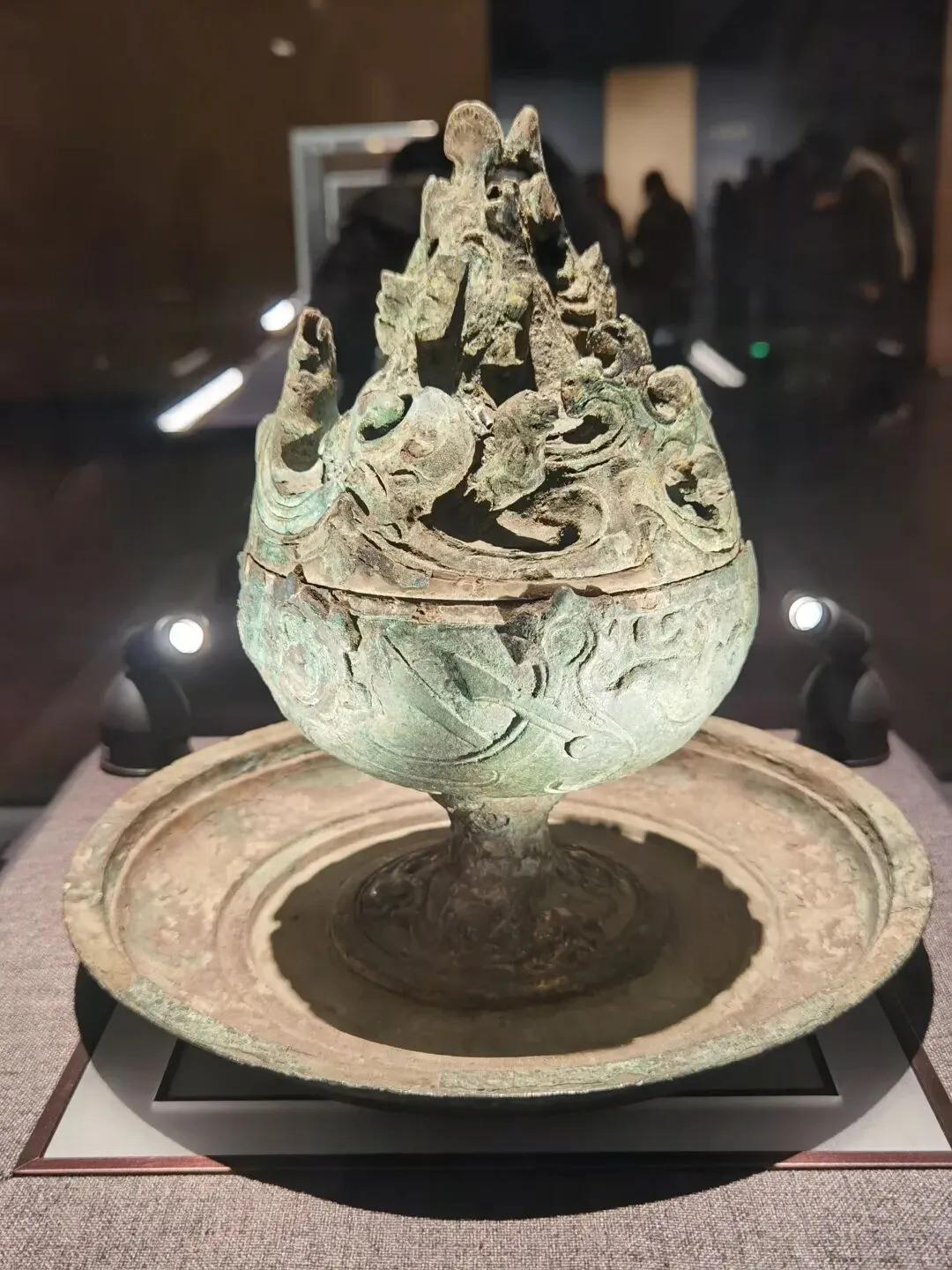 错金银神兽纹青铜当卢,主体纹饰有白虎、凤鸟、凤形鸾鸟、交龙等,辅助纹饰有太阳、月亮、山脉、云气、龟、鱼、金乌、蟾蜍、羽人等。纹饰复杂,内涵极为丰富,反映了汉代人的宇宙观及渴望长生不老、死后升仙的愿景,蕴含着独特的神话艺术神韵与艺术精神。雁鱼青铜釭灯,外形呈雁回首衔鱼伫立状,由雁衔鱼管、雁体、灯盘、灯罩组合而成,鱼身及雁颈、雁体中空相通。使用的时候灯火点燃,烟雾通过鱼和雁颈导入雁体内,被其中贮存的清水吸收溶解,达到环保无污染的效果。两片弧形灯罩可左右转动,既能挡风,又可调节灯光亮度、光照方向。雁鱼灯不仅造型优美、科学实用,还包含着吉祥的文化寓意,“鸿雁衔鱼”的祥瑞造型体现了汉代人对生活的美好愿望。