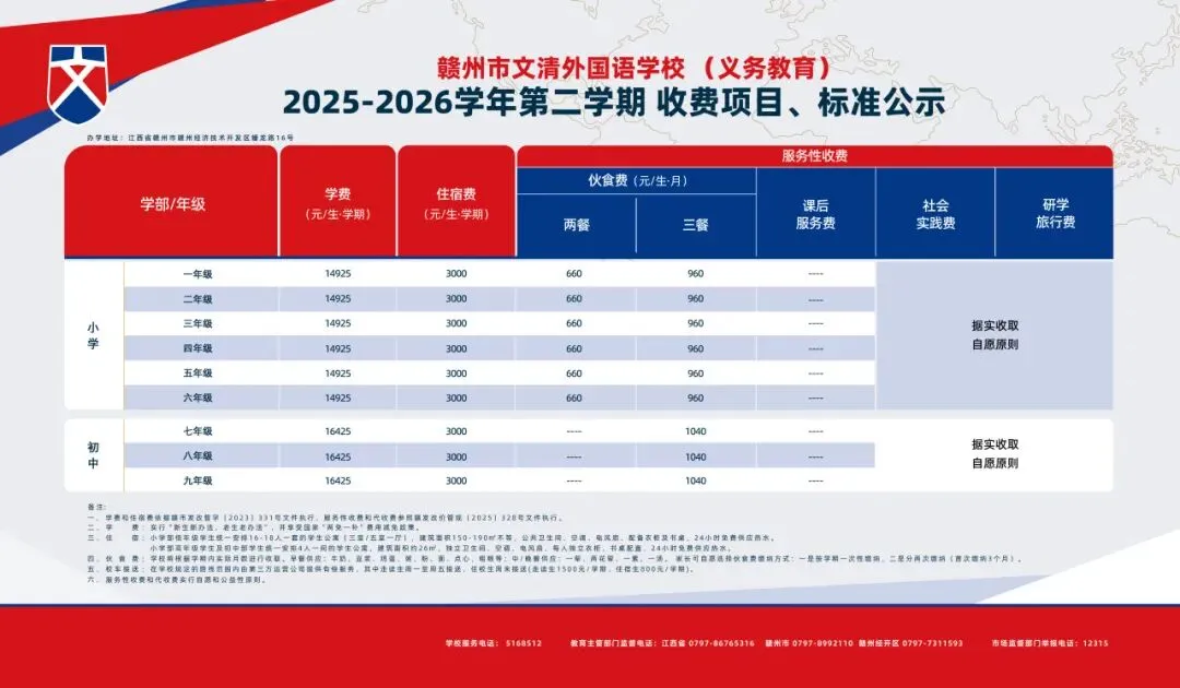 为规范我校收费行为,提高透明度,主动接受学生、家长及社会监督,切实维护各方合法权益,根据江西省发展改革委、江西省教育厅关于印发《江西省民办中小学校收费管理办法》的通知(赣发改价管规〔2023〕138号)等相关规定,现对2025-2026学年第二学期收费项目、标准予以公示。