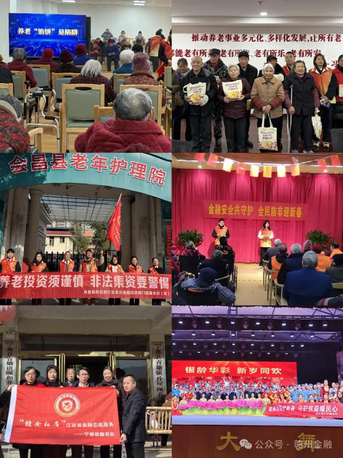 联合民政等相关部门组成“赣金红盾”金融志愿服务队,共同走进辖内养老院、敬老院、老年公寓、文艺演出等场所,通过举办“金融小课堂”、播放防非宣传片等,以“拉家常”的通俗表达拆解非法集资典型案例,守护老年群体财产安全。同时,为参与活动的老年群体发放印有防非提示的宣传布袋、纸巾、肥皂等实用物品,让老年人在使用过程中潜移默化地强化风险意识。