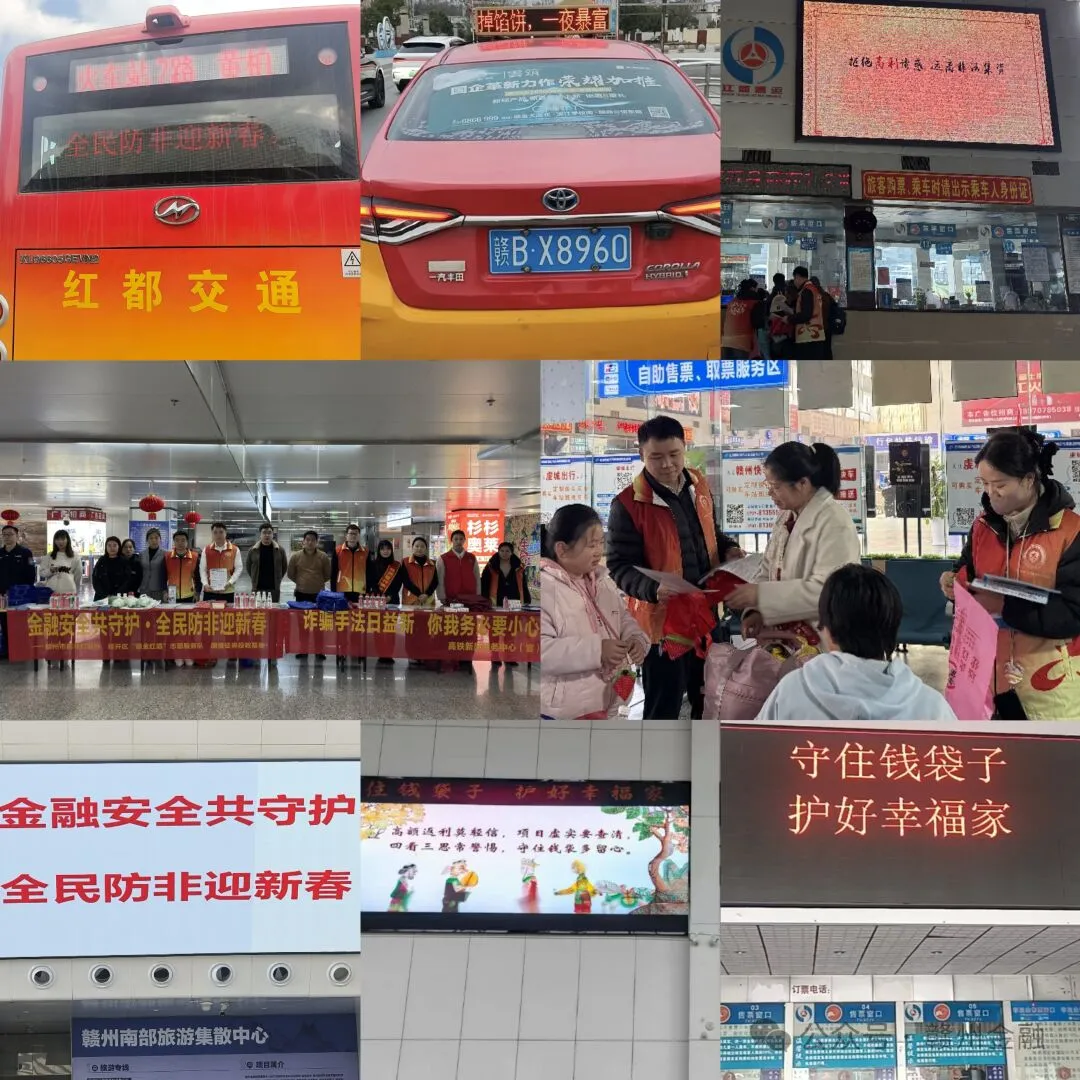 结合岁末年初人员流动大的特点,利用火车站、汽车客运站、公交车、出租车等交通枢纽LED大屏、电子终端等载体,滚动播放防非宣传标语、公益防非宣传视频等。同时,联合交通运输等部门组成“赣金红盾”金融志愿服务队,通过设置展板、发放宣传手册、面对面宣讲、现场答疑等多种形式,向过往旅客及司乘人员送上一份“金融安全大礼包”。