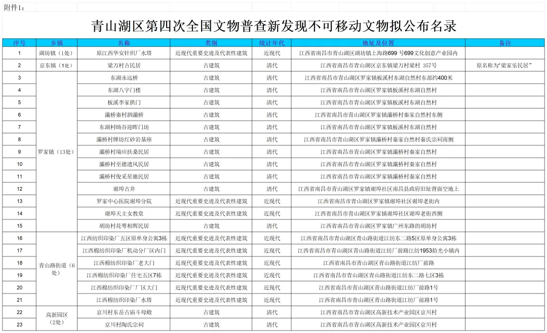 根据《中华人民共和国文物保护法》(2024年修订)、国家文物局《尚未核定公布为文物保护单位的不可移动文物保护管理暂行规定》(文物保发〔2021〕37号)及《第四次全国文物普查总体方案》文件精神,青山湖区第四次全国文物普查工作经过实地调查勘察、数据采集整理、初步审核认定等程序,拟公示不可移动文物23处,同时,针对第三次全国文物普查中部分文物名称进行变更,已完成1处文物名称的变更工作,现予以公示。
