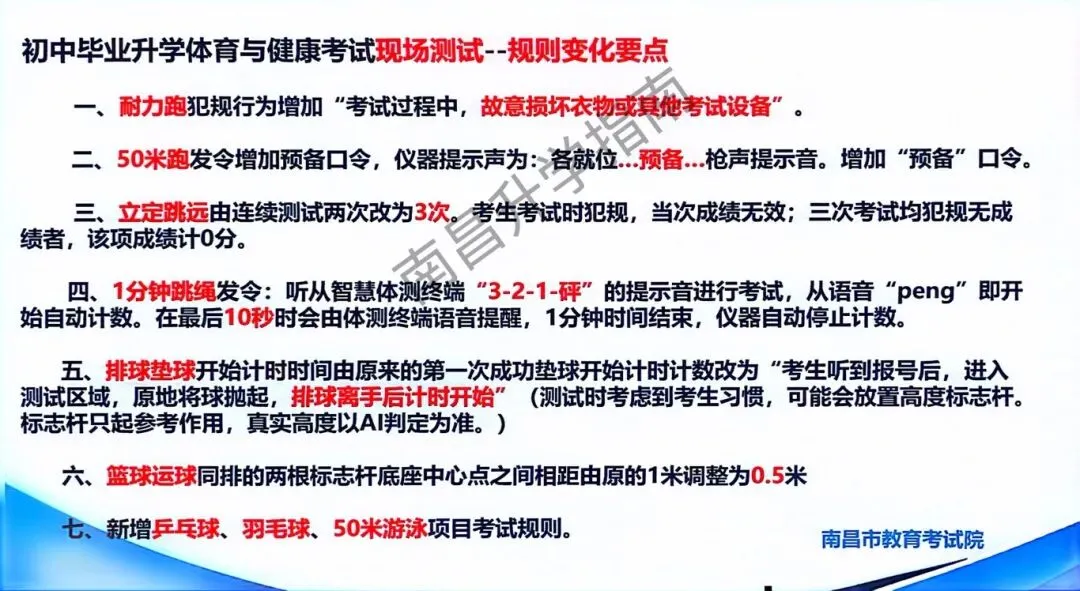 南昌市2026年初中毕业升学体育与健康考试现场测试45分,必考项目耐力跑占20分,素质类和技能类两个选考项目各占12.5分。
