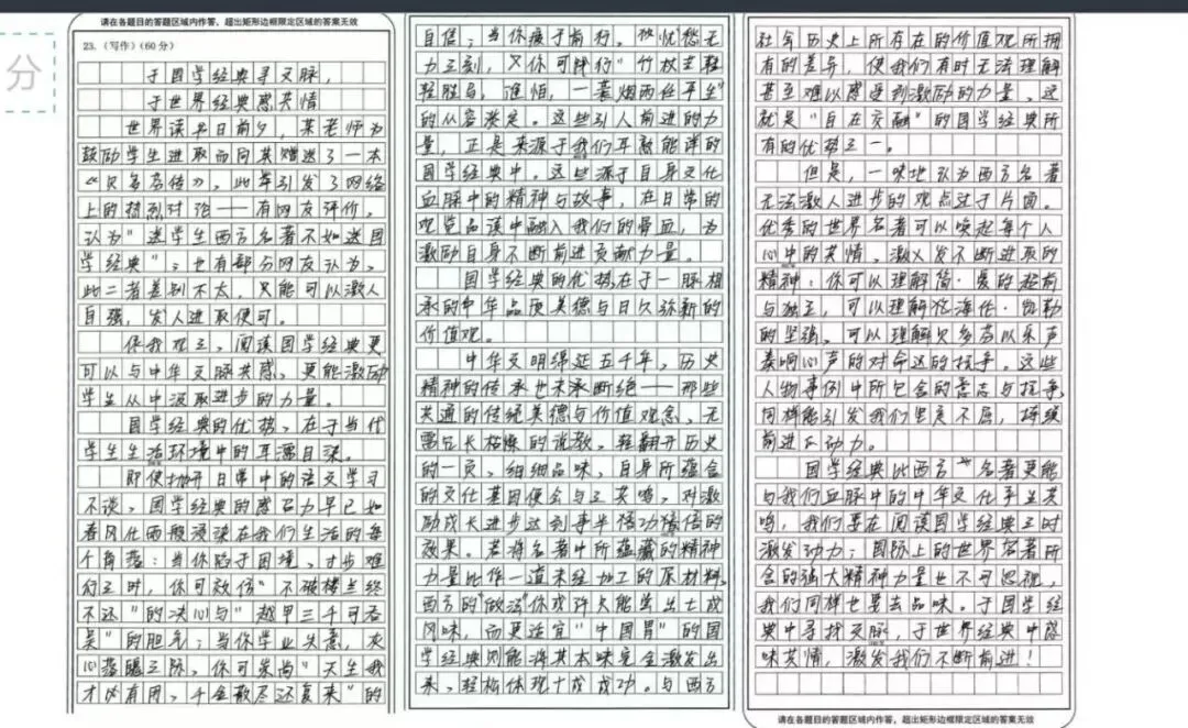 2.基本能从“为什么”角度阐述理由但角度不够鲜明,论述的内容蜻蜓点水,说服力不强,如“既要又要”的拼盘式文章——简单粗暴地“国学经典”一层,“西方名著”一层,最后直接说二者结合却不辩证分析,最多只能47分。