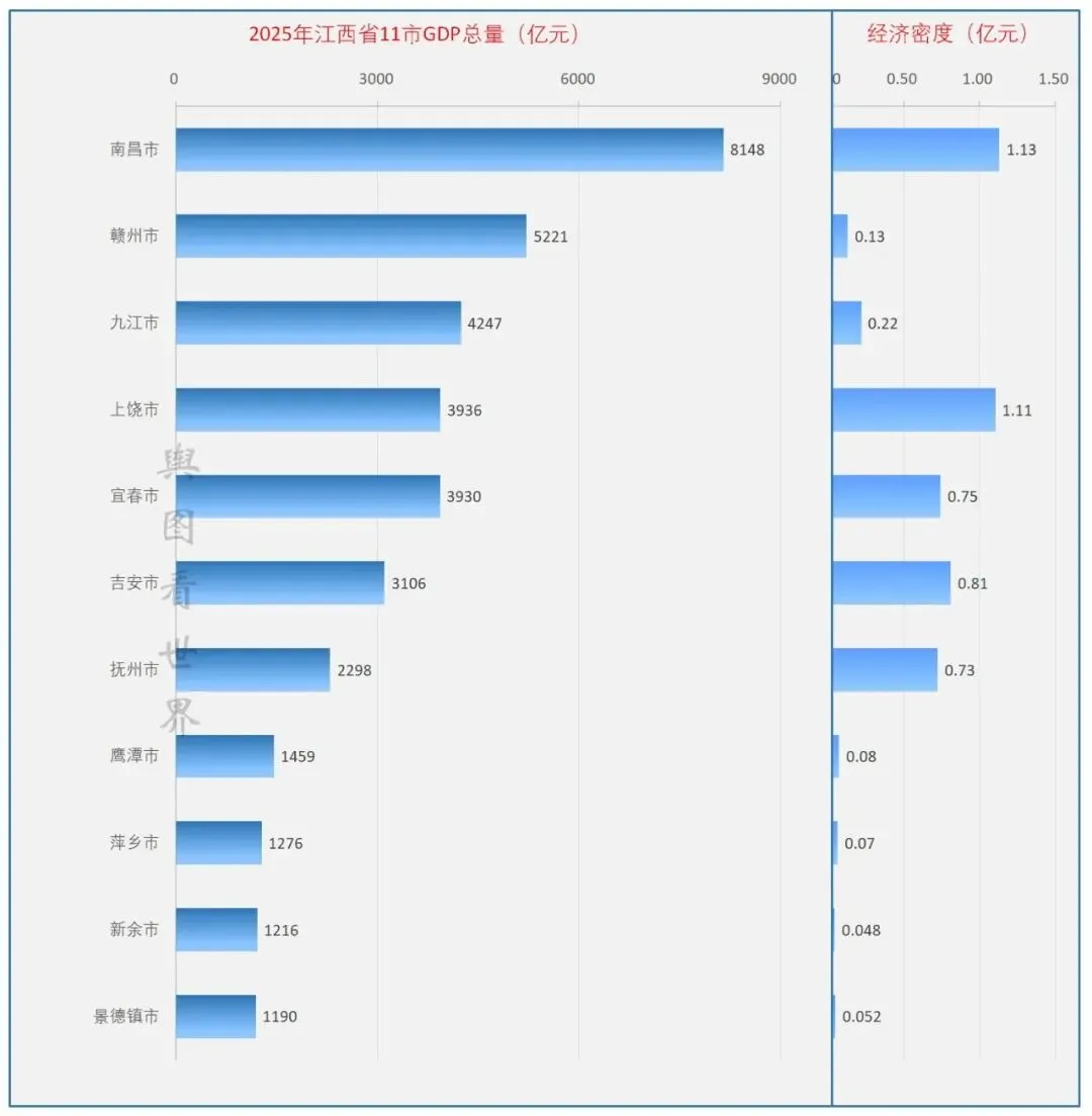 2025年江西省各地市GDP排名:南昌一城独大,赣州第二,鹰潭人均最高