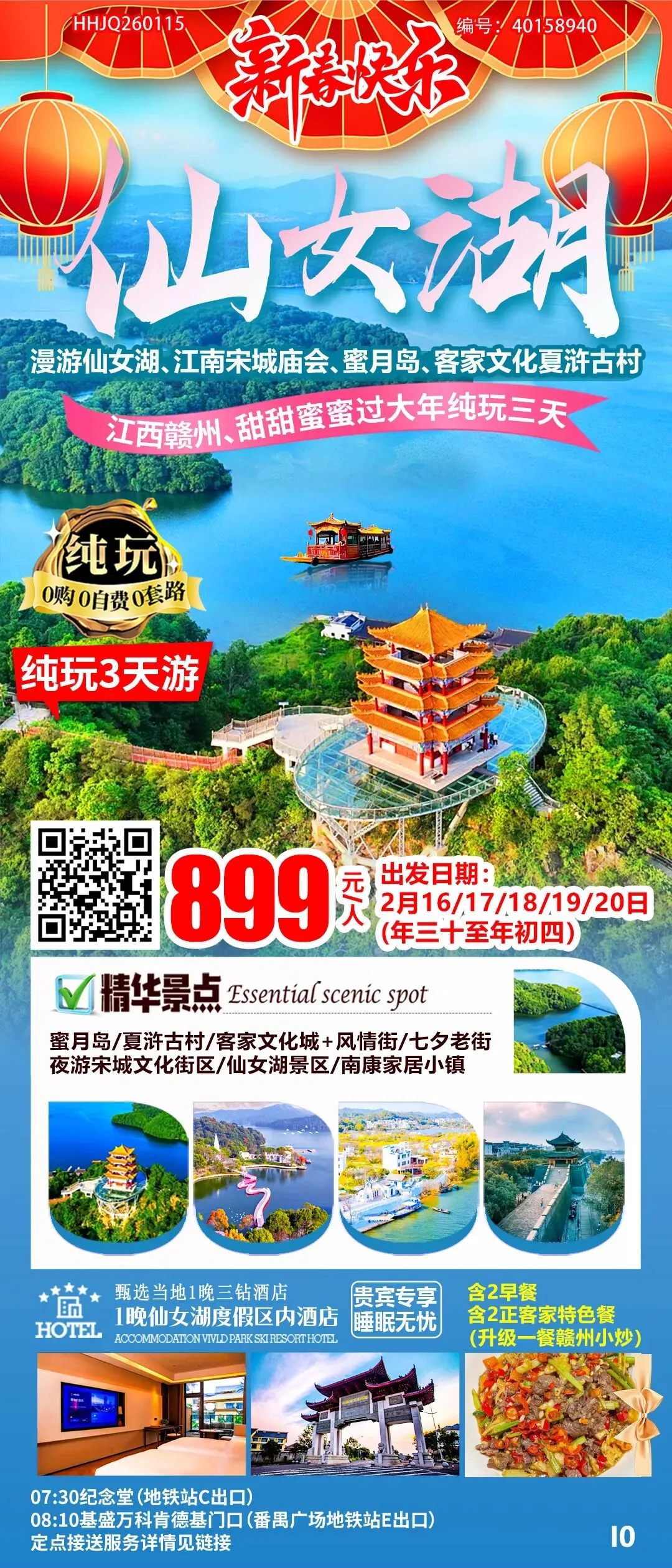 早餐后酒店集合,乘车前往新余市仙女湖度假区,仙女湖是闻名遐迩的湖泊型国家级风景名胜区、国家 AAAA 级旅游景区。景区位于江西省新余市西南郊 16 公里处,以 “情爱圣地、群岛峡谷曲水、水下千年古城、亚热带植物基因库” 四绝著称,曾获 “中国美丽湖泊型景区” 殊荣。