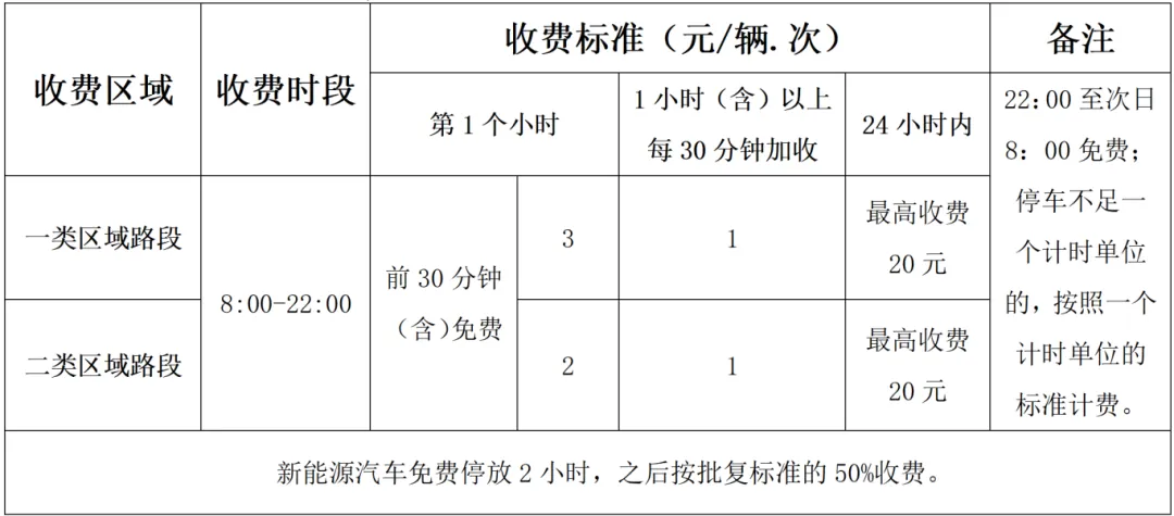 (一)执行任务的军车、警车、消防车、救护车、救灾抢险车、市政设施维护维修车、殡葬车等车辆,免收停车费; (二)临时停放的残疾人使用的已办理车牌证、驾驶证的专用机动车辆,免收停车费; (三)新能源汽车免费停放2小时,之后按批复标准的50%收费。