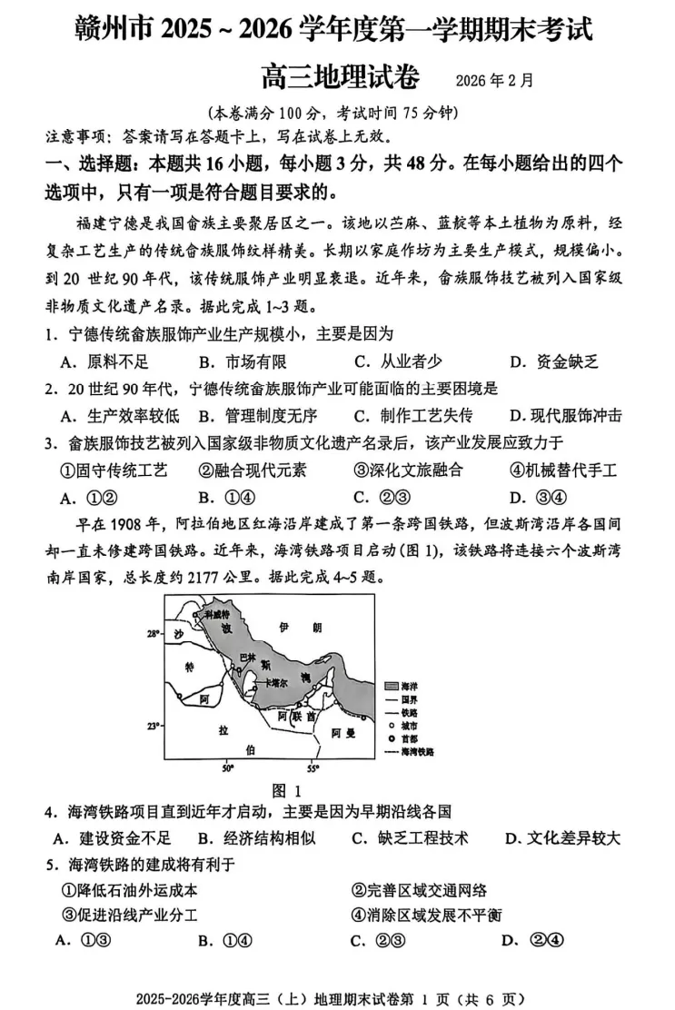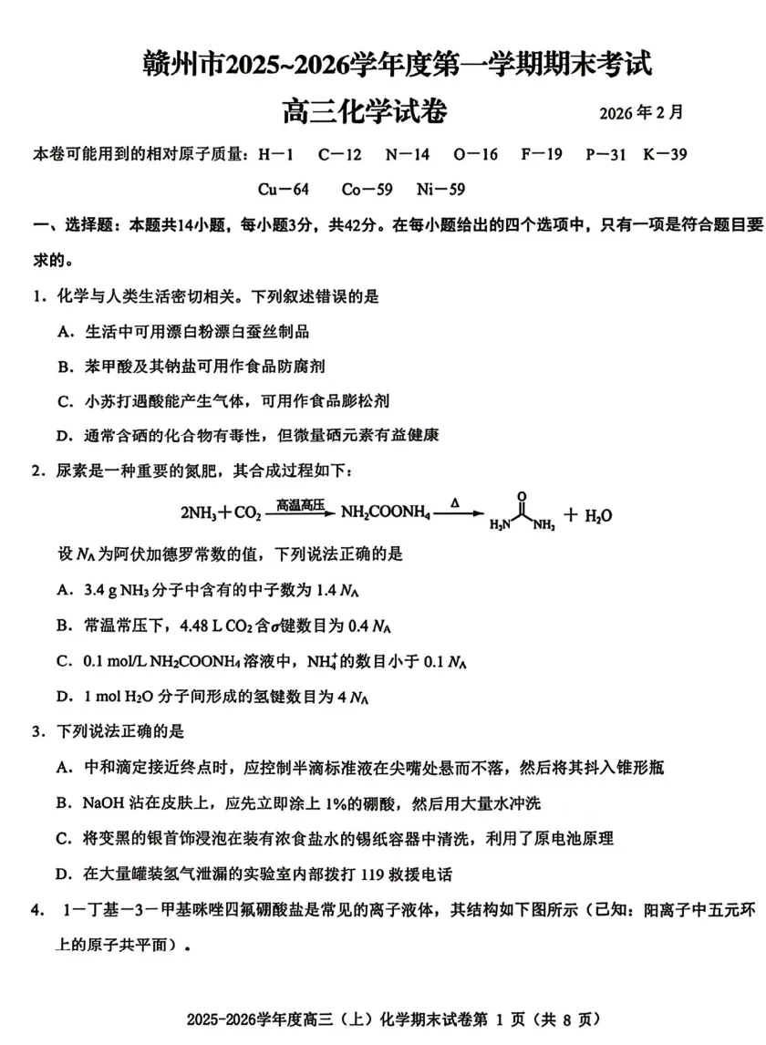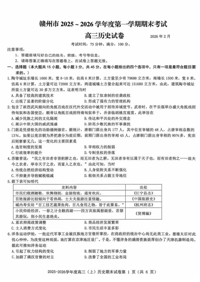 赣州市2025-2026学年度第一学期期末考试试卷及其答案下载
