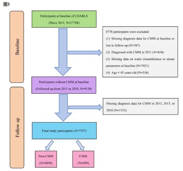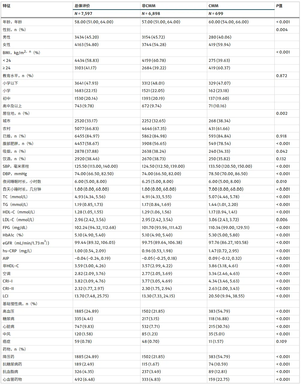👉本研究纳入 2011-2018 年 CHARLS 研究 7597 名参与者,平均年龄 58.00 岁、男性占 45.20%;经最长 7.0 年随访,基线未感染 CMM 的参与者中 699 人(9.20%)后续确诊 CMM。研究按 CMM 诊断分组分析人群基线特征发现,CMM 组更易为高龄、女性、AO 患者、非吸烟者,且多居住在城市;该组基线时慢性病(高血压、糖尿病、心脏病、中风)患病率及抗高血压、抗糖尿病等相关药物使用率均更高。同时,CMM 组的 SBP、DBP、白天午睡时长、血脂、血糖、炎症指标等多项指标水平显著更高,夜间睡眠时长、HDL-C、eGFR 则显著更低,且上述差异均有统计学意义(P<0.05)。表1 有无CMM参与者的基线特征