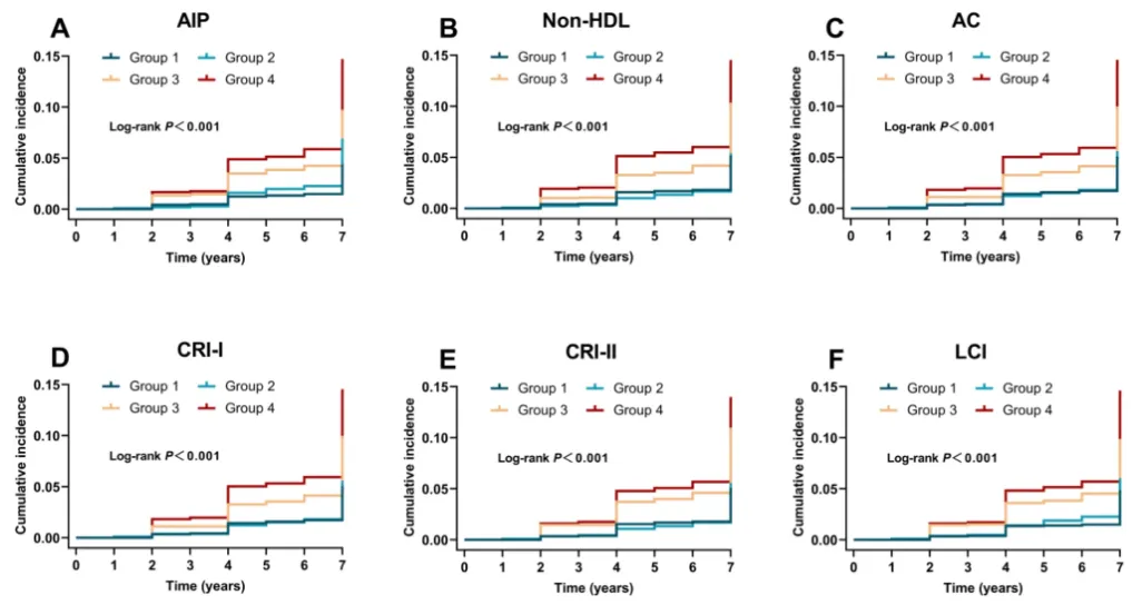 图2,腹部肥胖与非传统脂质参数(A-F)的CMM风险K-M图。