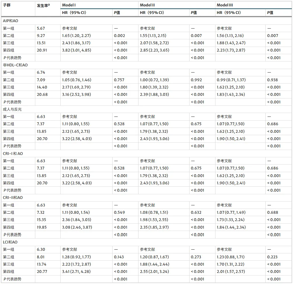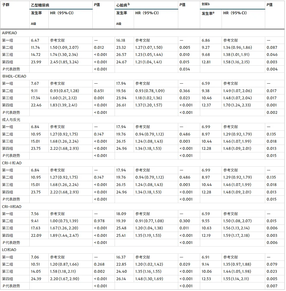 👉图 2 呈现非传统脂质参数与腹部肥胖(AO)联合评估下 CMM 的累计发病率,AO 合并高水平非传统脂质指标者的 CMM 发病率最高。经多变量调整的 Cox 回归分析显示,完全调整模型中,AO 且非传统脂质参数较高者的 CMM 发病风险最高,其次为 AO 且参数较低者,再是非 AO 且参数较高者,非 AO 且参数低于中位数者风险最低(表 2);其中 AO 且 AIP 指数高的亚组风险最显著(HR=2.23,95% CI=1.73–2.87)。