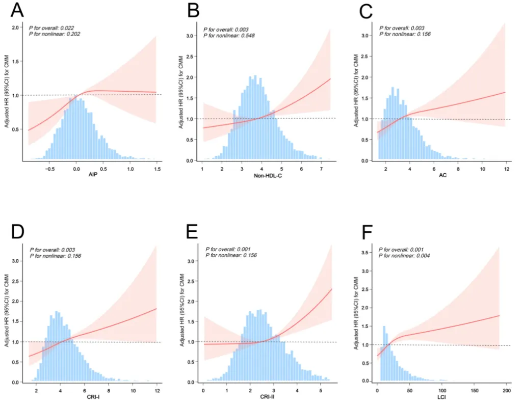 图3,非传统脂质参数与AO(A-F)参与者CMM风险之间的剂量-反应关系。