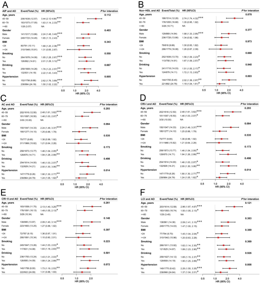 图4,基于腹部肥胖和非传统血脂参数(A-F)高水平的亚组,进行多变量调整的Cox回归分析森林图。