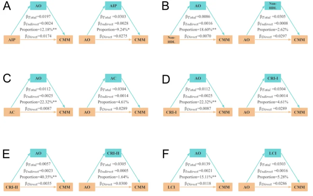 图5,腹部肥胖的介导分析,研究非传统脂质参数与发生CMM风险之间的关联。
