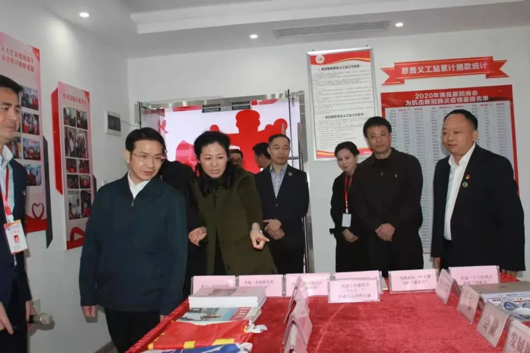 黄喜忠部长一行乘电梯来到鄱商大厦17楼商会的办公区,陆续参观了鄱阳湖形象墙、鄱商交流中心、鄱商之家、商会秘书处、商会荣誉室、商会慈善义工站、商会联合工会、“四好商会”展示墙、“活力鄱商”沙龙系列品牌活动展示墙等,黄喜忠部长还在参观中询问商会的发展以及相关的建设情况,并详细了解商会永久固定会产的打造和使用情况。