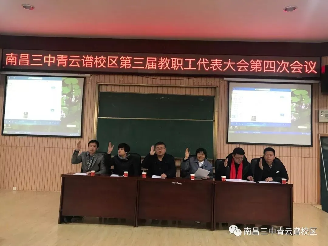1月17日上午,伴随着庄严的国歌声,南昌三中青云谱校区第三届教代会第四次会议在二楼多媒体报告厅顺利召开。