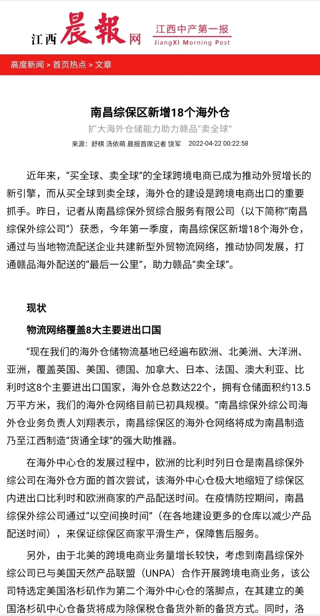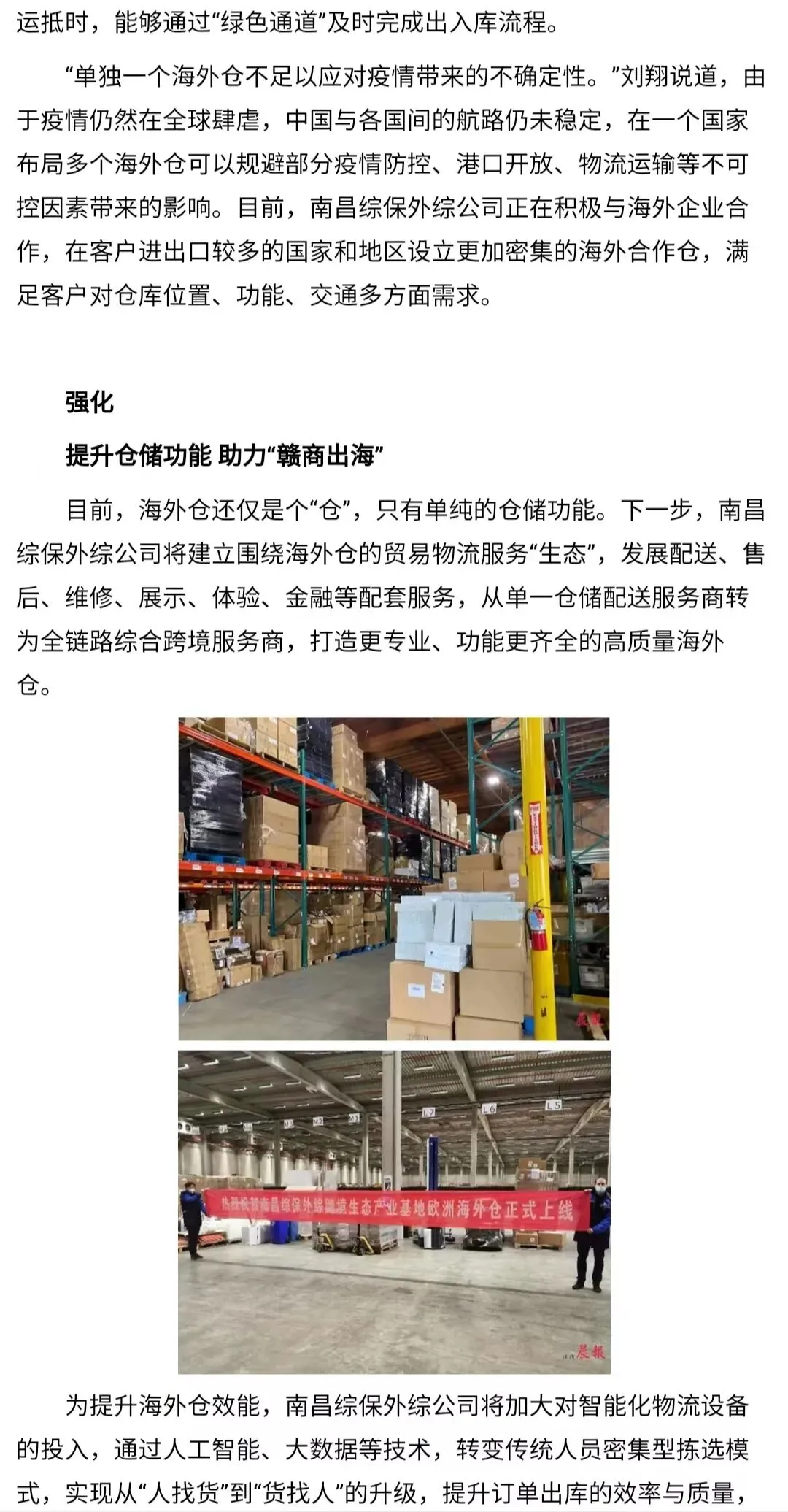 为助力本土企业“走出去”,南昌综保区还将加强与省内企业沟通协作,以“跨境电商+海外仓”的模式为本土企业搭建遍及全球的海外仓储服务平台,助力“赣商出海”。