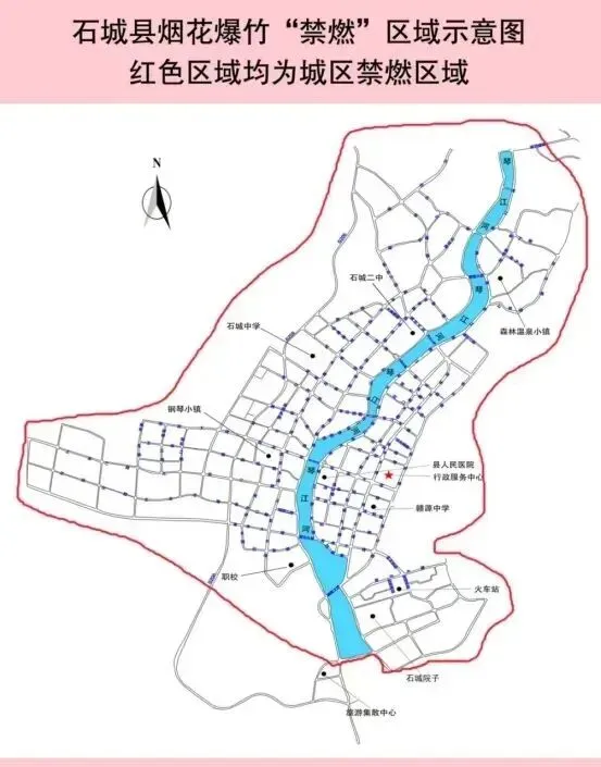 县城中心城区范围内,东至县人民法院、鸭子垅、翡翠城、东方红汽贸城沿线,南至石城院子、火车站、温坊工业园铜锣湾沿线,西至古樟工业园、学府雅苑、石城中学沿线,北至琴江镇人民政府、樾龙台、百萝口小区、亲亲幸福里、森林温泉小镇沿线(见附图);《石城县禁限放烟花爆竹管理规定(修订)》第四条中规定的农村乡镇林区、车站、幼儿园、托儿所、医院、敬老院、集贸市场、居民小区、公共娱乐场所、机关单位、文物保护单位、自然保护区、墓区等重点单位场所。