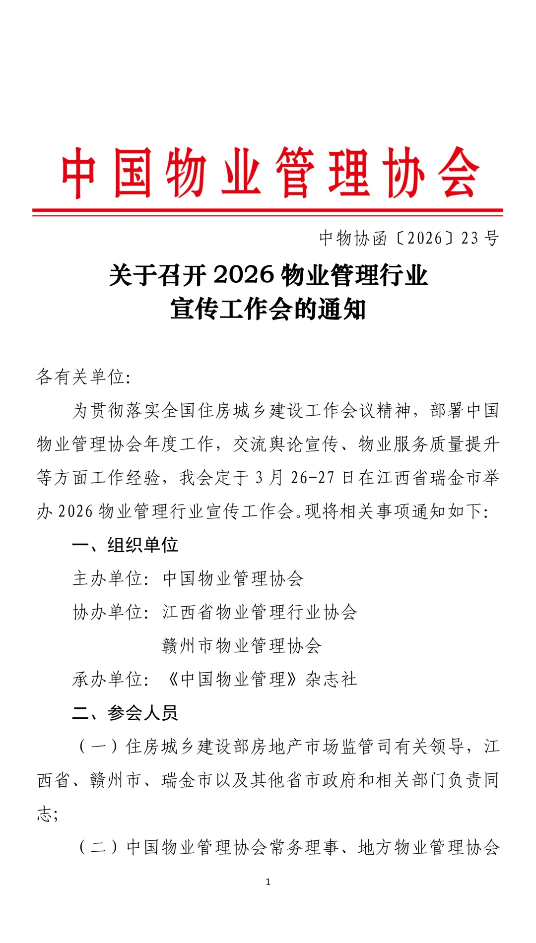 中国物业管理协会日前正式发布通知,定于2026年3月26日至27日在江西瑞金干部学院举办 “2026 物业管理行业宣传工作会”。此次会议由中国物业管理协会主办,江西省物业管理行业协会、赣州市物业管理协会协办,《中国物业管理》杂志社承办,为贯彻落实全国住房城乡建设工作会议精神,部署中国物业管理协会年度工作,交流舆论宣传、物业服务质量提升等方面工作经验。
