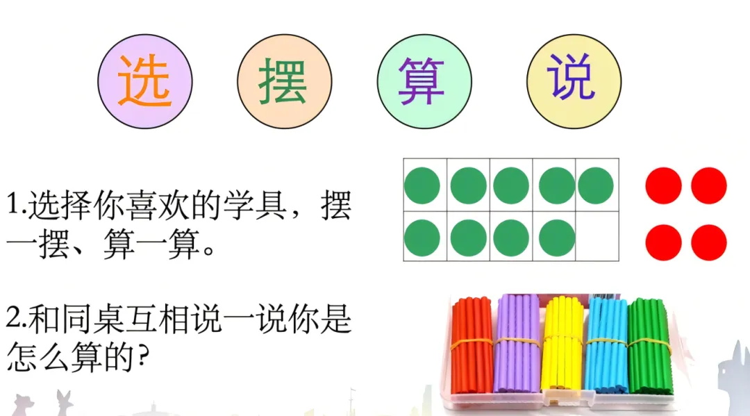 提问:看来,9+4的结果可以数出来。除了用数出来的方法,还可以怎么算呢?请同学们按以下要求动手试一试。