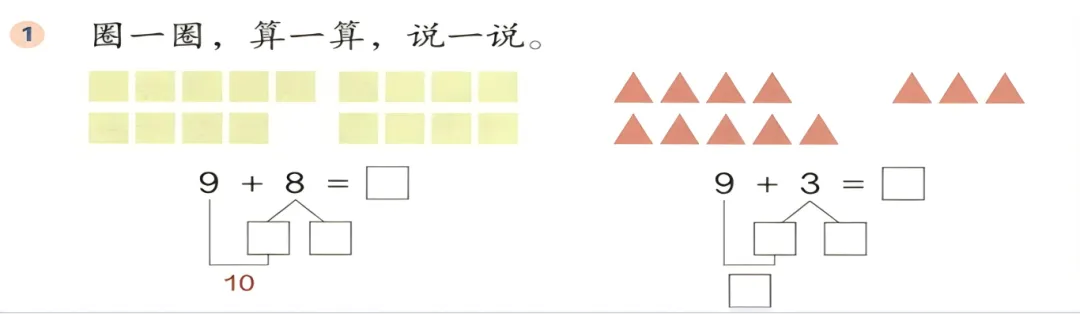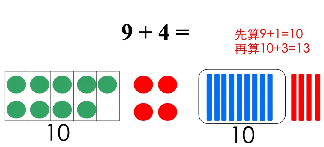 师小结:无论是移一移、还是摆一摆,它们的方法都是一样的——都是从4里面拿出了1个,先算9+1=10,再算10+3=13。我们把这种计算方法叫作“凑十法”