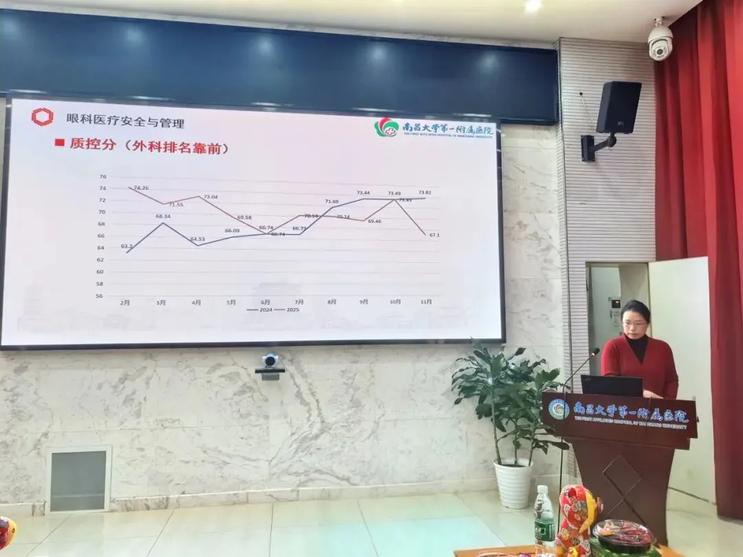 眼科副主任周荃作全年医疗质量与安全管理工作总结。她指出,过去一年科室严格对标国家及专科质控规范,健全管理体系、细化考核标准,推动质控工作常态化精细化开展,医疗服务质量与效率同步提升,切实筑牢患者就医安全防线。展望2026年,眼科要立足高质量发展主线,聚焦专科能力提质,着力提升诊疗技术层级,积极拓展四级手术与特色新技术,持续强化疑难重症诊治能力,完善质控长效机制,实现专科质控与临床发展同频增效。