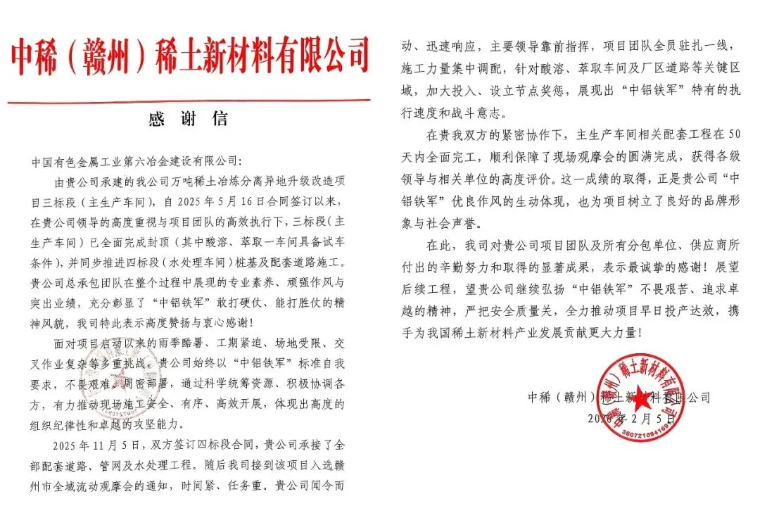 近日,中稀(赣州)稀土新材料有限公司向六冶公司发来感谢信,对六冶承建的万吨稀土冶炼分离异地升级改造项目三、四标段建设成果给予高度肯定,赞誉六冶项目建设团队敢打硬仗、能打胜仗的优良作风。