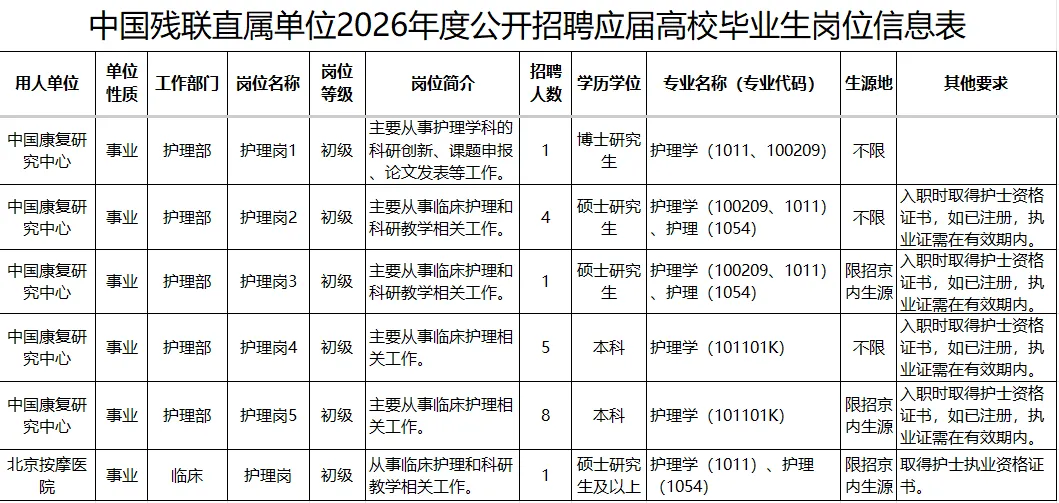 2、报名方式:采用网上报名方式,报考中国康复研究中心、中国康复科学所的考生,请按照附件2中明确的方式网上报名。报考其他单位的人员,请下载并填写《应聘人员报名表》(附件3),发送至所报考单位的报名邮箱(见附件2),邮件主题格式为:“报考2026年度+用人单位名称+岗位名称(岗位序号)+姓名”。每人限报1个岗位,多报无效。考生在中国残联机关及所属单位有近亲属关系和主要社会关系的,需主动向所报考单位报告。