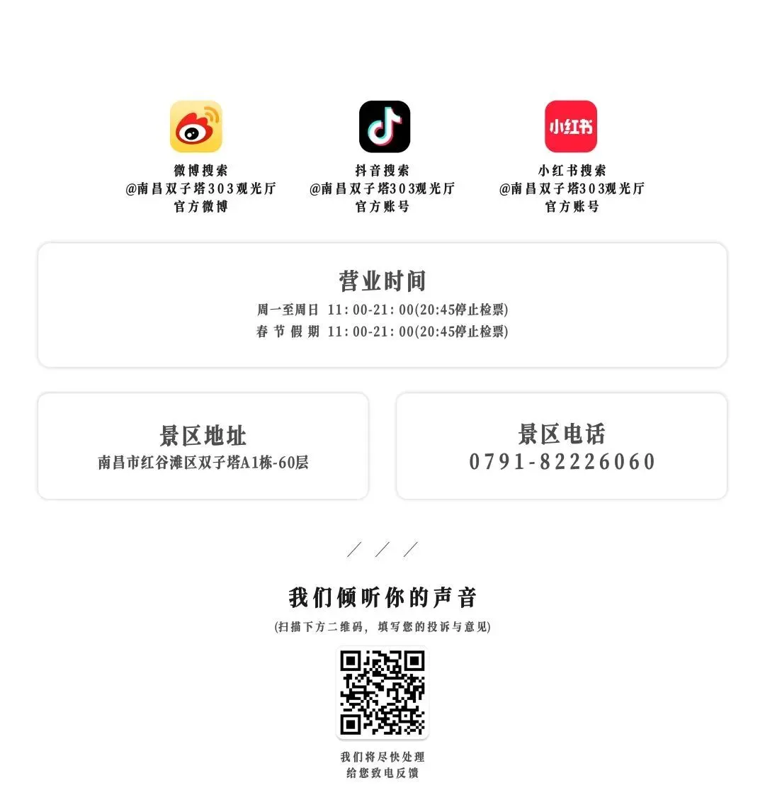 当日门票仅限通过官方线上渠道购买。请您认准 “南昌双子塔303观光厅”官方微信小程序,完成信息填写并购票,避免购买假冒门票造成损失。