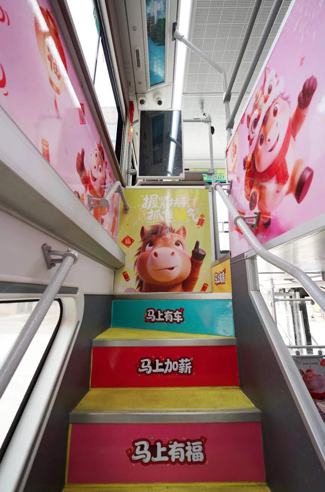 车厢内打造了多个马年主题打卡点,楼梯台阶贴有“马上成功”“马上顺利”等彩色吉祥语贴纸,市民乘车时,每一步都踩在新春祝福里;楼梯过道的粉色主题壁画上,萌趣小马搭配福字、灯笼、烟花等元素,以及“握紧扶手 抓住福气”的趣味提示牌,让整个车厢成为可触摸、可打卡的沉浸式新春空间。