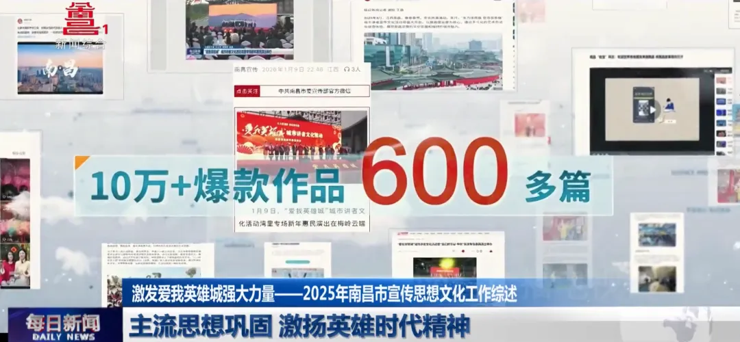 2025年,“辉煌‘十四五’ 奋进新征程”重大主题宣传浓墨重彩。市属媒体连续四年全过程、全方位、全天候拍摄记录省市重大重点项目进程,制作纪录片《爱我英雄城 奋进新征程》、纪实画册《南昌2025聚力发展能级新跃升》,在2026年全市两会首发推出,并在其他重要会议场合播出。市融媒体中心矩阵粉丝破3600万,“洪观新闻”新媒体品牌的传播力影响力不断提升。南昌广播电视台“有风自南”工作室入选中国记协首批优秀案例,“绿茵路1号”影响持续扩大,媒体融合从“相加”迈向“相融”,主流声音更加响亮。