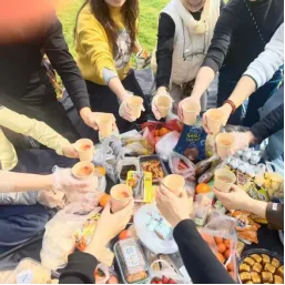 下山后的野餐时光同样令人雀跃。琳琅满目的美食堆积如山,大家围坐草地,分享畅谈。梅梅亲手制作的手工馒头香甜有嚼劲;仲瑶老师特意带来的清远手撕鸡香气扑鼻,最受欢迎;脆生生的水果胡萝卜让人人变身“小白兔”;滋味十足的鸭脖转眼便被分完;面包、蛋糕、零食林林种种;薯片袋被调皮地拍得砰砰作响;橘子与小番茄一口一个,清甜满溢;还有热乎乎的银耳汤,大家举杯相庆,暖意融融。