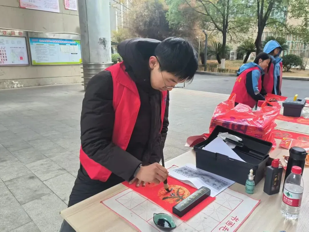活动现场,红纸铺展,墨香盈室。来自南昌市外国语学校的学生志愿者凝神运笔,挥毫书写,将新春的祈愿落于一副副对联、一张张“福”字之中。