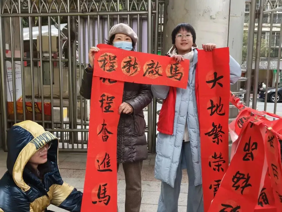 居民们有序驻足,挑选心仪的吉言,并与身披志愿服的“小书法家”合影留念。镜头前,居民手持墨迹犹润的春联,笑容温暖;学子立于一侧,神情专注而自豪。一幅幅画面,定格了校社之间的情谊,也留存了传统佳节将至的温馨瞬间。