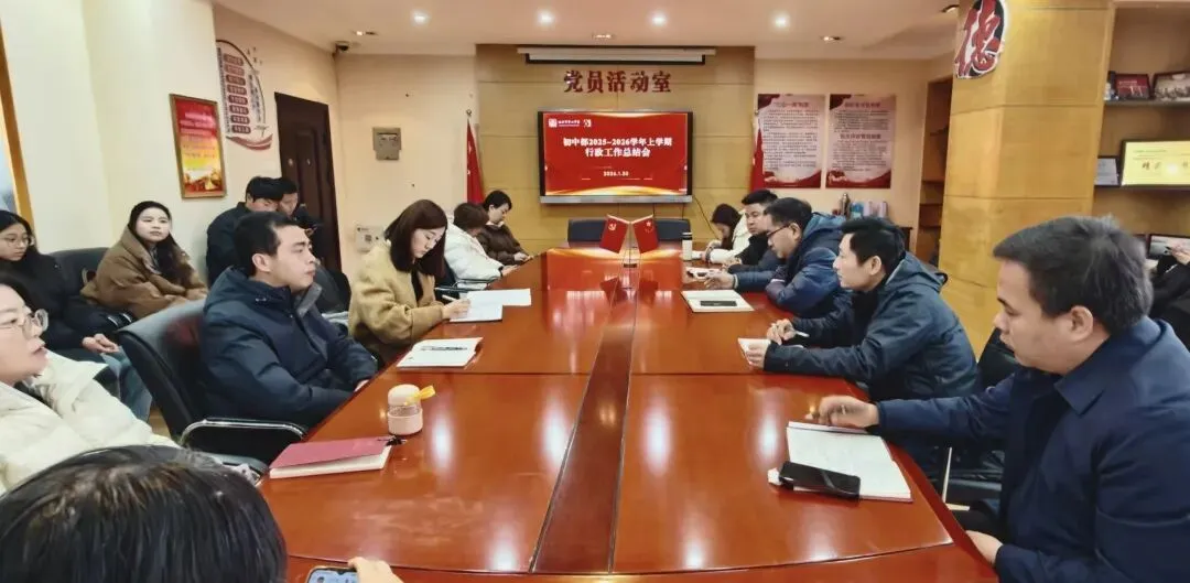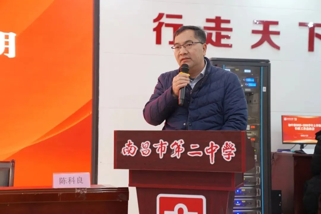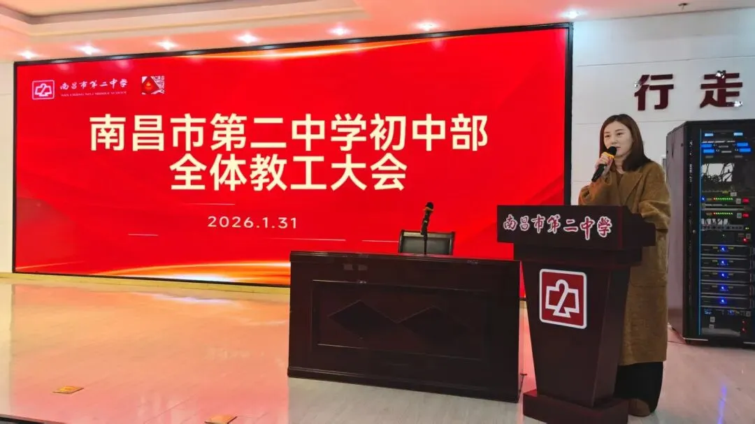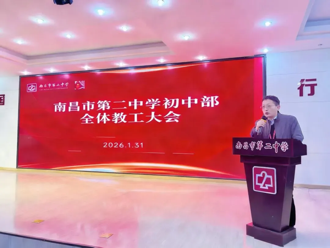 1月31日下午,南昌二中初中部2025-2026学年第一学期期末全体教工大会在初中部一楼学术报告厅举行。南昌二中党委委员、副校长唐思峰、章易明,南昌二中初中部执行校长陈科良,各部门中层领导出席,全体教职工参加。会议由初中部党政办负责人熊艳主持。
