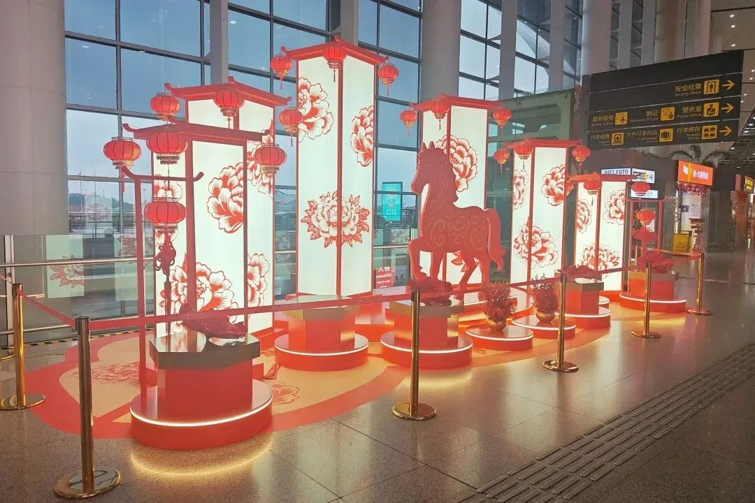 走进航站楼,最吸睛的莫过于前往安检必经之路上的马年主题美陈!它将生肖马元素与传统民俗花灯工艺巧妙融合,造型飒爽、寓意吉祥,妥妥的 “最佳出片点”。吸引往来旅客驻足合影,用镜头定格这份新春限定的美好,让旅途多了一份仪式感,讨个“一马当先”的好彩头!