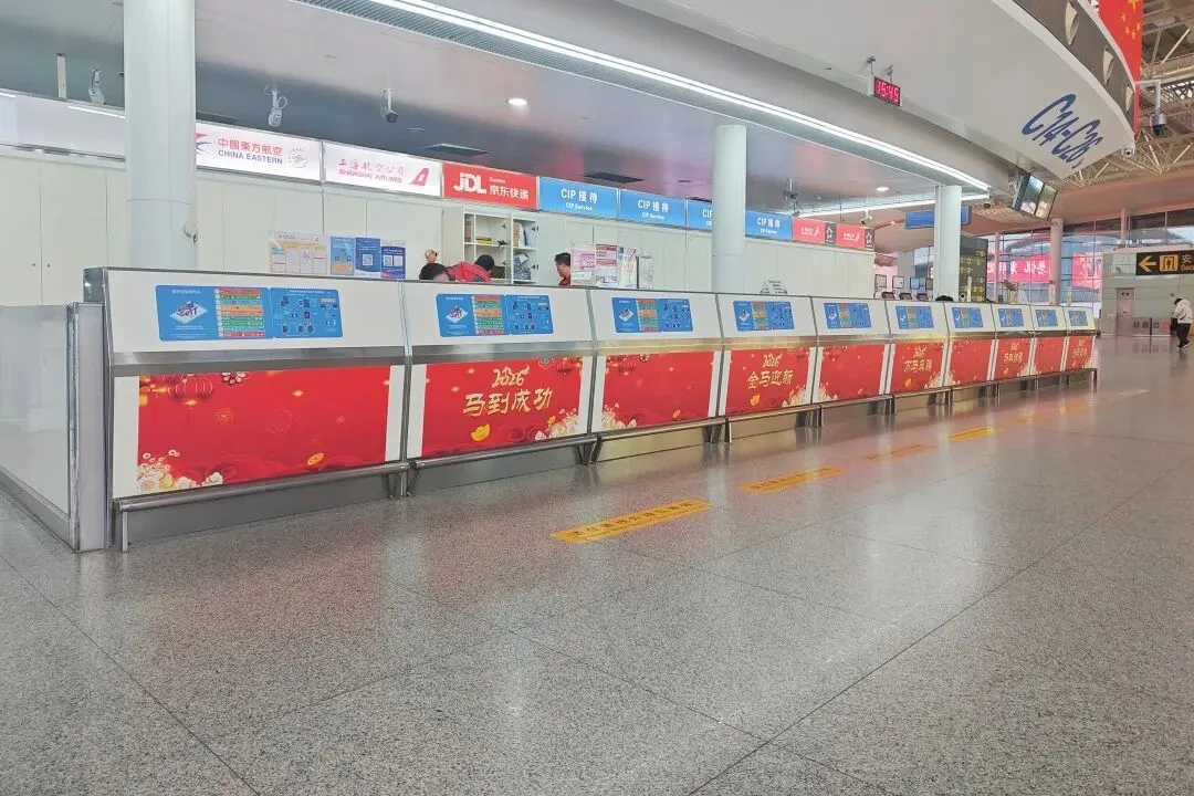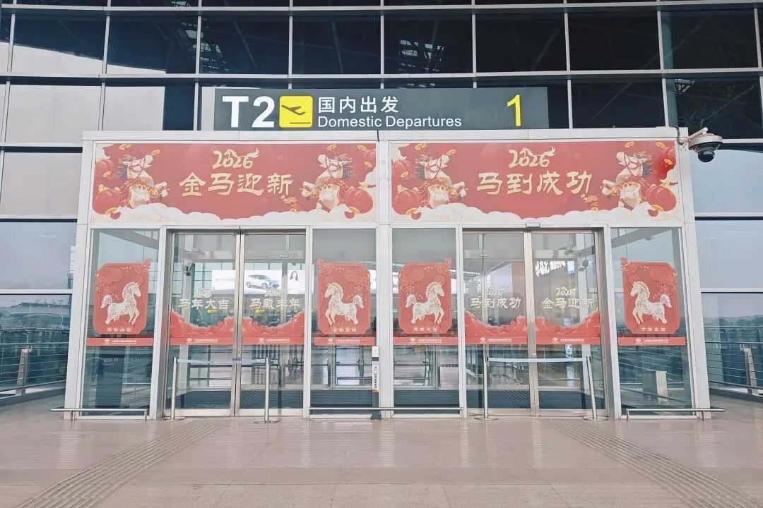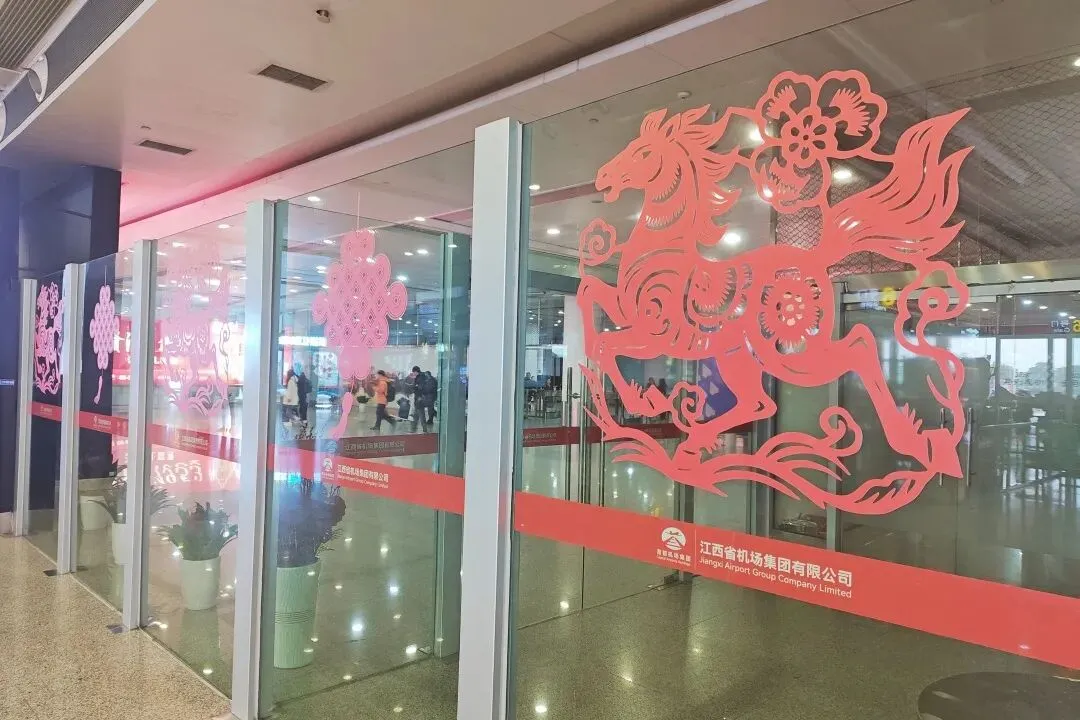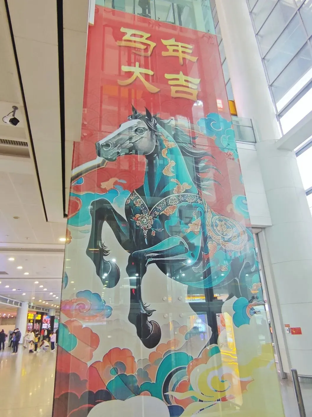 从出入口到服务柜台,连观光电梯都穿上了新年主题“贴画新衣”!红色主调搭配灵动骏马图案,一路走来仿佛漫步在传统年画中。一步一景的视觉点缀,层层递进的喜庆氛围,我们希望通过这些精心设计的视觉符号,让您的出行之路满载喜庆与温暖。