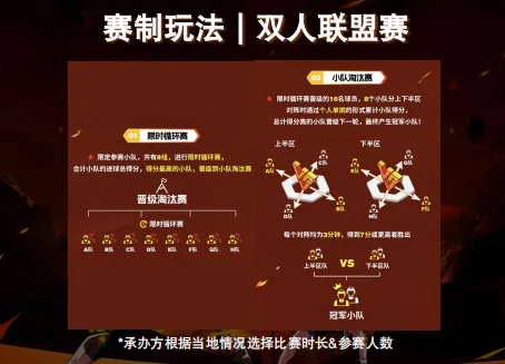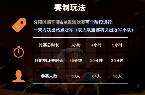 分限时循环赛&单败淘汰赛两个阶段进行,一天内决出站点冠军(双人联盟赛将决出冠军小队)。