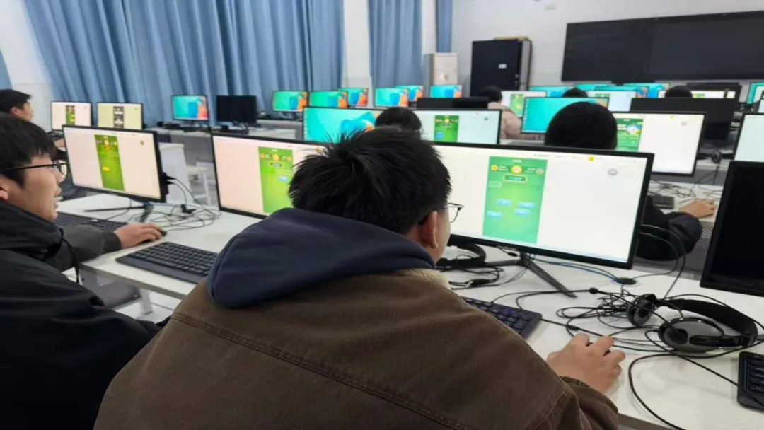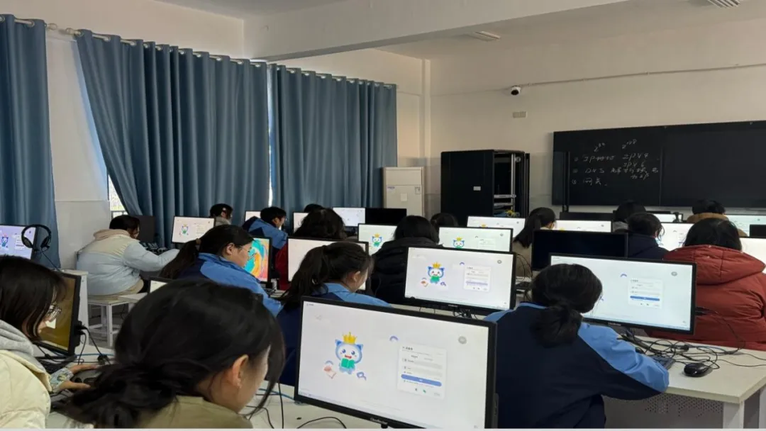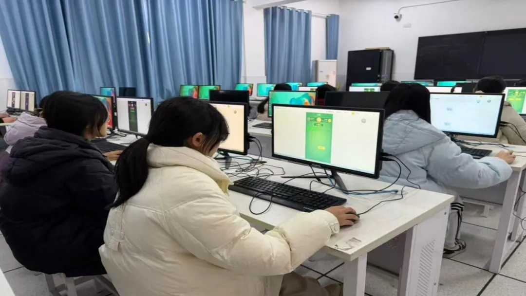 1月13日,决赛在实验楼计算机教室如期举行。线上测试分为两轮:单词PK环节通过“看英选中”“看中选英”30道题目考验快速反应与词汇辨识力;拼词PK环节则以20道“看中拼英”题目,检验单词拼写的精准度。AI系统实时计分、精准计时,得分相同者以用时较短者排名靠前,全程公平公正、高效便捷。